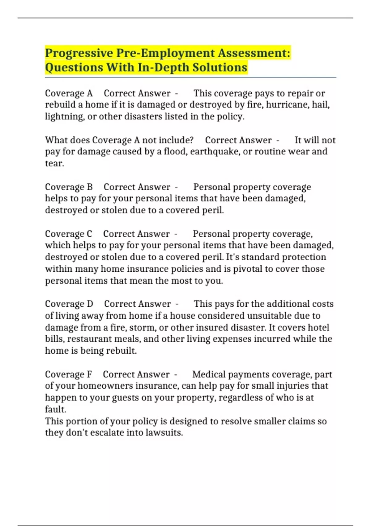 Coverage D Correct Answer - This pays for the additional costs