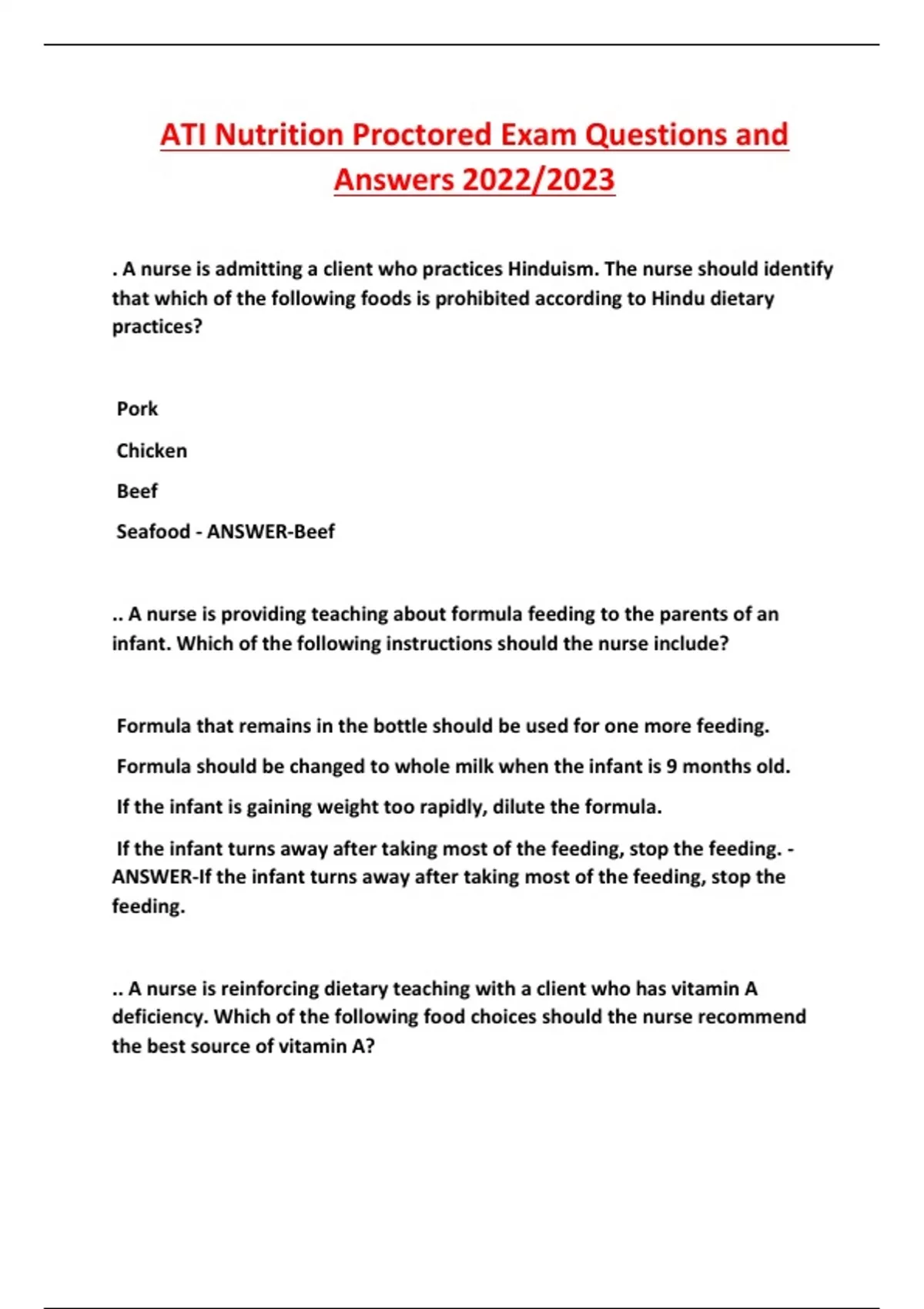 ATI Nutrition Proctored Exam Questions and Answers 2022/2023 . A nurse is admitting a client who practices Hinduism. The nurse should identify that which of the following foods is prohibited according to Hindu dietary practices? Pork Chicken Beef Seafood - ANSWER-Beef .. A nurse is providing teaching about formula feeding to the parents of an infant. Which of the following instructions should the nurse include? Formula that remains in the bottle should be used for one more feeding. Formula should be changed to whole milk when the infant is 9 months old. If the infant is gaining weight too rapidly, dilute the formula. If the infant turns away after taking most of the feeding, stop the feeding. - ANSWER-If the infant turns away after taking most of the feeding, stop the feeding. .. A nurse is reinforcing dietary teaching with a client who has vitamin A deficiency. Which of the following food choices should the nurse recommend the best source of vitamin A? 1 small baked sweet potato 1 cup avocado 1 cup green beans 1 large apple - ANSWER-1 small baked sweet potato .. A nurse is teaching a client who has chronic kidney disease about dietary needs. Which of the following foods should the nurse identify as being the lowest in phosphorus? Medium apple Bran cereal Scrambled eggs Ground turkey - ANSWER-Medium apple .. A nurse is teaching an in-service about manifestations of hypoglycemia to a group of newly licensed nurses. Which of the following should the nurse include in the teaching? Blurred vision Vomiting Kussmaul respirations Bradycardia - ANSWER-Blurred vision .A client is prescribed a 1500 calorie diet. Thirty percent of the calories are to be derived from fat. How many grams of fat should the nurse tell the client to consume per day? (Round the answer to the nearest whole number. Use a leading zero if it applies. Do not use a trailing zero.) - ANSWER-50 .A home health nurse is conducting an initial visit with an older adult client. The client lives alone and has difficulty preparing his own meals. Which of the following actions should the nurse take first? Discuss nutritional requirements with the client. Refer the client to a senior citizen center. Arrange for a home-delivered meal program. Perform a nutrition screening. - ANSWER-Perform a nutrition screening. .A nurse has just inserted an NG tube for a client who is to start enteral tube feedings. Which of the following actions should the nurse take to verify tube placement? Measure the tube length. Obtain an abdominal x-ray. Flush the tube with 20 mL of water. Auscultate the client's lungs - ANSWER-Obtain an abdominal x-ray. .A nurse in a providers office is reviewing the laboratory values of a client who reports a poor appetite. Which of the following value should a nurse reported provider? - ANSWER-Hgb 10 g .A nurse is a long-term care facility is developing strategies to promote increased food intake for an older adult client. Which of the following interventions should the nurse implement? Offer sugar substitutes to increase the client's appetite. Provide opportunities to eat three large meals per day. Provide entertainment while the client is eating. Offer finger foods at mealtime. - ANSWER-Offer finger foods at mealtime. .A nurse is administering continuous enteral feedings for a client through a peg tube. Which of the following action should the nurse take? - ANSWER-Return gastric contents if residual is less than 250 ml .A nurse is assessing a client at mealtime who is at risk for aspiration following a stroke. Which of the following action should the nurse take? - ANSWER-Instruct the client to tuck her chin when swallowing .A nurse is assessing a client who has a stage III pressure ulcer that is healing poorly. The nurse should identify that which of the following vitamin deficiencies increases the client's risk for delayed wound healing? Vitamin C Vitamin D Vitamin E Vitamin B6 - ANSWER-Vitamin C .A nurse is assessing a client who is receiving TPN. The nurse should recognize that which of the following is a metabolic complication associated with an infusion of TPN? - ANSWER-Azotemia .A nurse is assessing a client who reports muscle spasms in his calves and tingling in his hands. The client indicates consuming a low intake of milk products and green leafy vegetables. The nurse should identify that the clients findings indicate a deficiency in which of the following sources of nutrition? Iron Omega 3 fatty acids Vitamin C Calcium - ANSWER-Calcium .A nurse is assessing the nutritional status of an infant who is 6 months old. The infant weighed 2.7 kg at birth. Which of the following indicate to the nurse that the infant is within expected range? 5.5 kg 6.4 kg 4.5 kg 3.6 kg - ANSWER-5.5 kg .A nurse is assisting in the selection of food for a client who has hypokalemia. Which of the following foods should a nurse electric that contains the greatest amount of potassium? - ANSWER-One small, baked potato .A nurse is caring for a 30-month-old toddler and is preparing a nutritional snack. Which of the following foods is appropriate for the nurse to offer the toddler? Plain popcorn Grapes Raw carrots Cheese - ANSWER-Cheese .A nurse is caring for a client a major burn injury and is receiving TPN. Which of the following lab tests is the priority for the nurse to use to confirm the client is receiving adequate nutrition? Iron Magnesium Folic acid Prealbumin - ANSWER-Prealbumin .A nurse is caring for a client who consume 40,000 µg of vitamin D daily for three months. For which of the following finding should the nurse monitor to identify vitamin a toxicity? - ANSWER-Headache .A nurse is caring for a client who follows the dietary laws of Orthodox Judaism. Which of the following meal choices should the nurse request for the client? Turkey and cheese sandwich Spaghetti with tomato sauce