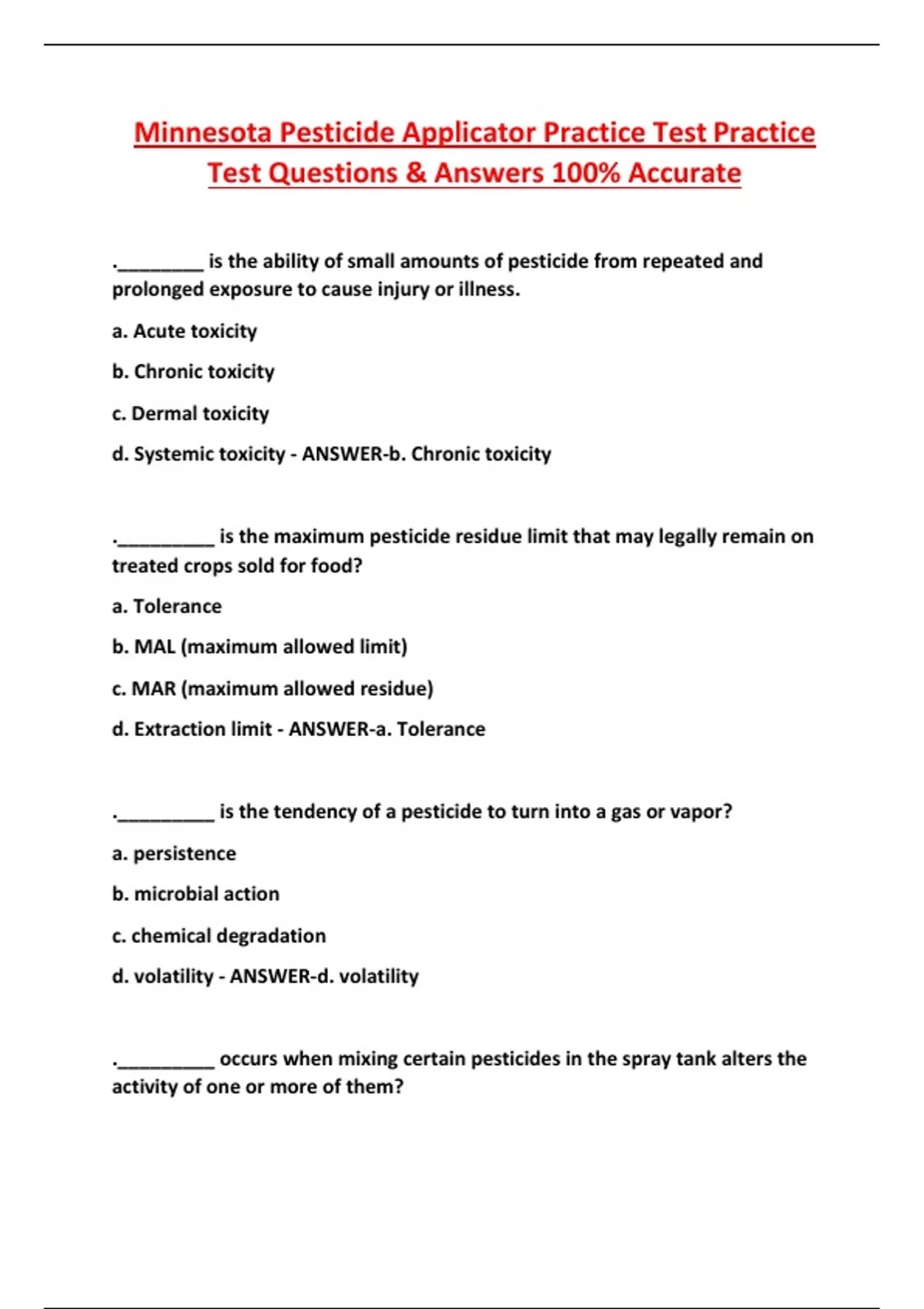 Minnesota Pesticide Applicator Practice Test Practice Test Questions & Answers 100% Accurate .________ is the ability of small amounts of pesticide from repeated and prolonged exposure to cause injury or illness. a. Acute toxicity b. Chronic toxicity c. Dermal toxicity d. Systemic toxicity - ANSWER-b. Chronic toxicity ._________ is the maximum pesticide residue limit that may legally remain on treated crops sold for food? a. Tolerance b. MAL (maximum allowed limit) c. MAR (maximum allowed residue) d. Extraction limit - ANSWER-a. Tolerance ._________ is the tendency of a pesticide to turn into a gas or vapor? a. persistence b. microbial action c. chemical degradation d. volatility - ANSWER-d. volatility ._________ occurs when mixing certain pesticides in the spray tank alters the activity of one or more of them? a. chemical incompatibility b. physical incompatibility c. placement incompatibility d. timing incompatibility - ANSWER-a. chemical incompatibility ._________ words on a pesticide label indicate the relative acute toxicity of the product? a. Hazard words b. Caution words c. Danger words d. Signal words - ANSWER-d. Signal words .__________ are chemicals that do not possess pesticidal activity but are added to enhance pesticidal performance. a. Adjuvants b. Fumigants c. Repellents d. Emulsifiable concentrates - ANSWER-a. Adjuvants .___________ is the failure of the pesticide products to stay uniformly mixed in the spray tank. a. Chemical incompatibility b. Physical incompatibility c. Placement incompatibility d. Timing incompatibility - ANSWER-b. Physical incompatibility .____________ are pesticides that are either naturally derived or synthesized. a. Chemical controls b. Biologic controls c. Natural controls d. Applied controls - ANSWER-a. Chemical controls ."backflow" refers to? a. ponds that fill up quickly when flow is blocked b. applying permethrin by backpack along a tree line c. filling adulticide application equipment d. none of the above - ANSWER-c. filling adulticide application equipment .A _________ occurs when one liquid is dispersed in another liquid/ a. A solution b. A suspension c. An emulsion d. A concentrate - ANSWER-c. An emulsion .A __________ is an animal or insect that can carry and transmit a pathogen from one host to another? a. virus b. vector c. bacteria d. none of the above - ANSWER-b. vector .A pesticide may be used to control a target pest not specified on the label if the pesticide is applied to a crop, animal, or site specifically listed on the label. a. True b. False - ANSWER-a. True .A wind meter is useful for determining when it is a good time to spray? a. true b. false - ANSWER-a. True .absorption is the process whereby a pesticide binds to soil particles. typically, oil-soluble particles are more attracted to? a. limestone/sandstone surfaces b. clay and organic material c. rock and sandy material d. none of the above - ANSWER-b. clay and organic material .According to the worker protection standard, a pesticide handler must have access to what if the label requires goggles for eye protection? a. Eyewash dispenser b. first aid kit c. full-face respirator d. half-face respirator - ANSWER-a. Eyewash dispenser .Adult mosquitoes are attracted to dark colors, carbon dioxide, and? a. blood b. plant nectar c. lighted areas d. running water - ANSWER-c. lighted area