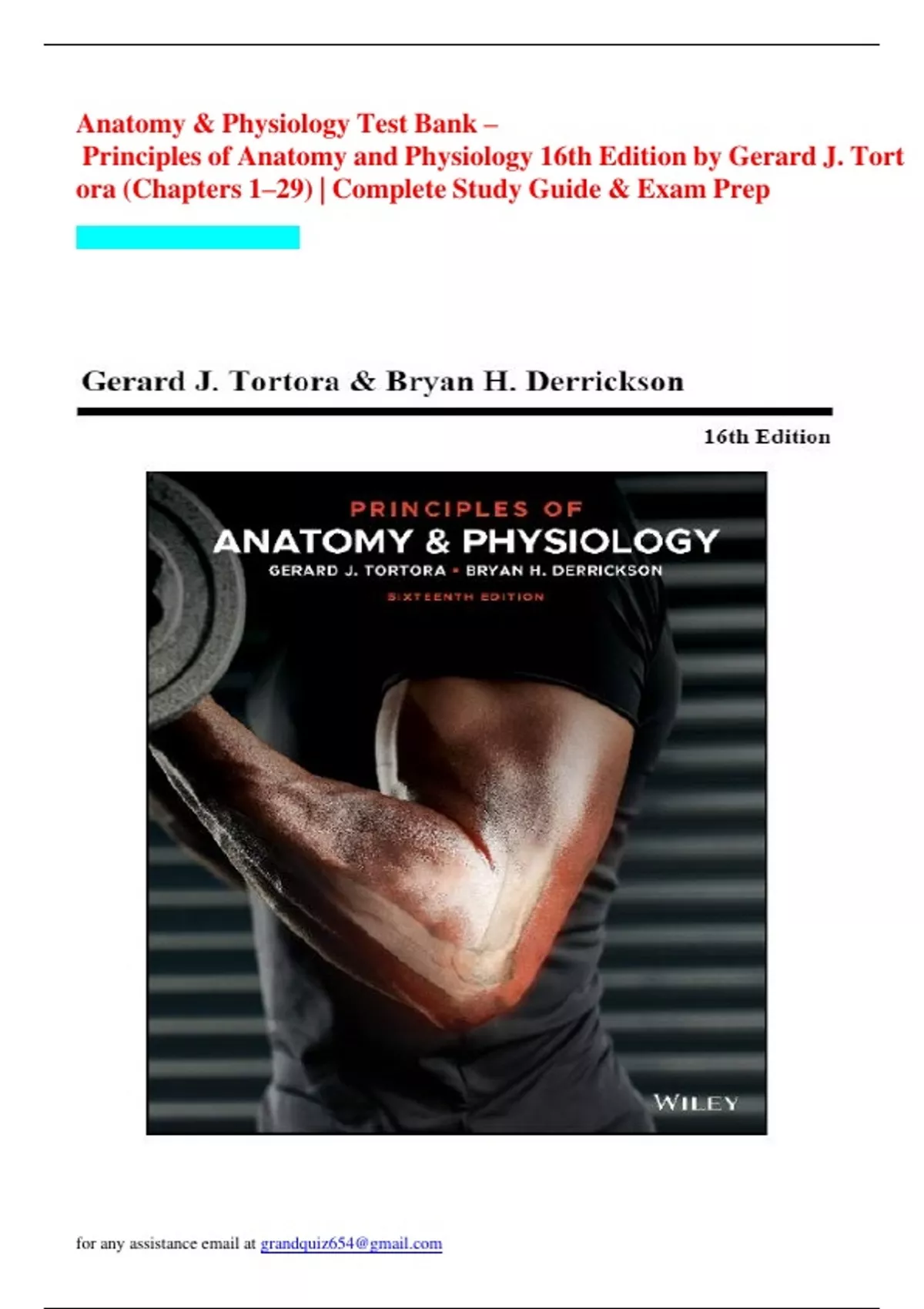 Anatomy & Physiology Test Bank – Principles of Anatomy and Physiology 16th Edition by Gerard J. Tortora (Chapters 1–29) | Complete Study Guide & Exam Prep 9780470615133Anatomy & Physiology Test Bank – Principles of Anatomy and Physiology 16th Edition by Gerard J. Tortora (Chapters 1–29) | Complete Study Guide & Exam Prep 9780470615133Ace your A&P exams with this complete Test Bank for Principles of Anatomy and Physiology (16th Edition) by Gerard J. Tortora. Covering Chapters 1–29, this study resource includes hundreds of practice questions and detailed answers designed to help you master key anatomical and physiological concepts. What You’ll Get: 500+ Exam-Style Questions: Comprehensive Q&As from all chapters with accurate, well-explained answers. Full Coverage: Topics include cells, tissues, body systems, homeostasis, muscles, nervous system, cardiovascular system, and more. Perfect for A&P Students: Ideal for nursing, pre-med, biology, and other healthcare-related fields. Directly Aligned with Tortora’s 16th Edition: Study efficiently with content that follows the textbook chapter-by-chapter. Why This Test Bank Works: Clear & Concise Answers: Each question is followed by a rationale to reinforce understanding. Organized for Easy Use: Find what you need quickly — structured by chapters and learning objectives. Boosts Exam Confidence: Great for quizzes, midterms, finals, or general concept review.