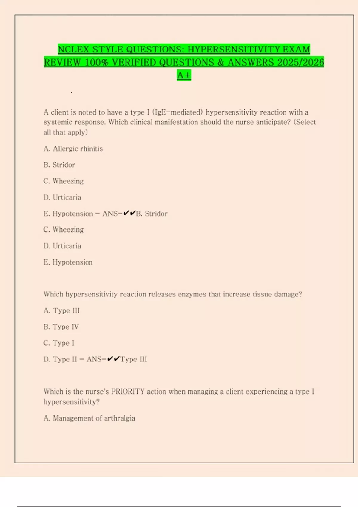 NCLEX STYLE QUESTIONS: HYPERSENSITIVITY EXAM REVIEW 100% VERIFIED QUESTIONS & ANSWERS 2025/2026 A+ A client is noted to have a type I (IgE-mediated) hypersensitivity reaction with a systemic response. Which clinical manifestation should the nurse anticipate? (Select all that apply) A. Allergic rhinitis B. Stridor C. Wheezing D. Urticaria E. Hypotension - ANS-B. Stridor C. Wheezing D. Urticaria E. Hypotension Which hypersensitivity reaction releases enzymes that increase tissue damage? A. Type III B. Type IV C. Type I D. Type II - ANS-Type III Which is the nurse's PRIORITY action when managing a client experiencing a type I hypersensitivity? A. Management of arthralgia B. Airway management C. Stopping the blood transfusion D. Decreasing a fever - ANS- CONTINUES...