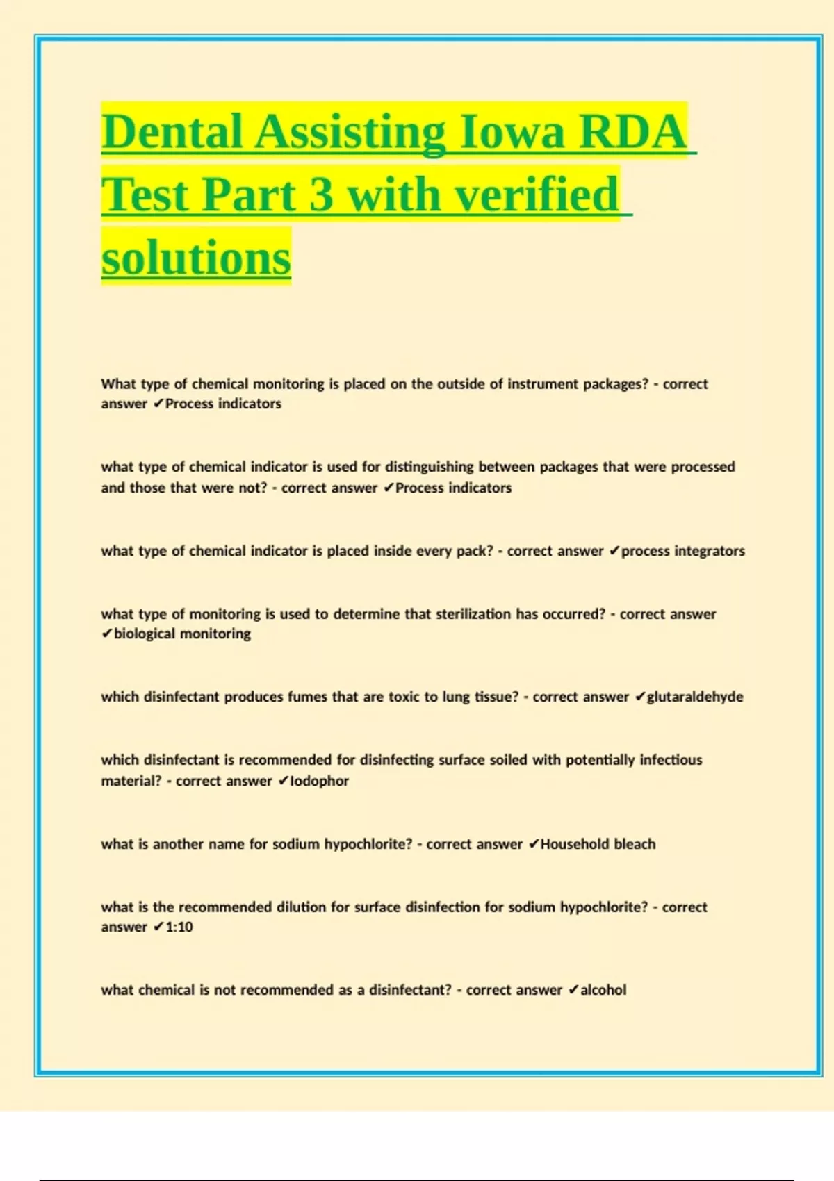 Dental Assisting Iowa RDA Test Part 3 with verified solutions