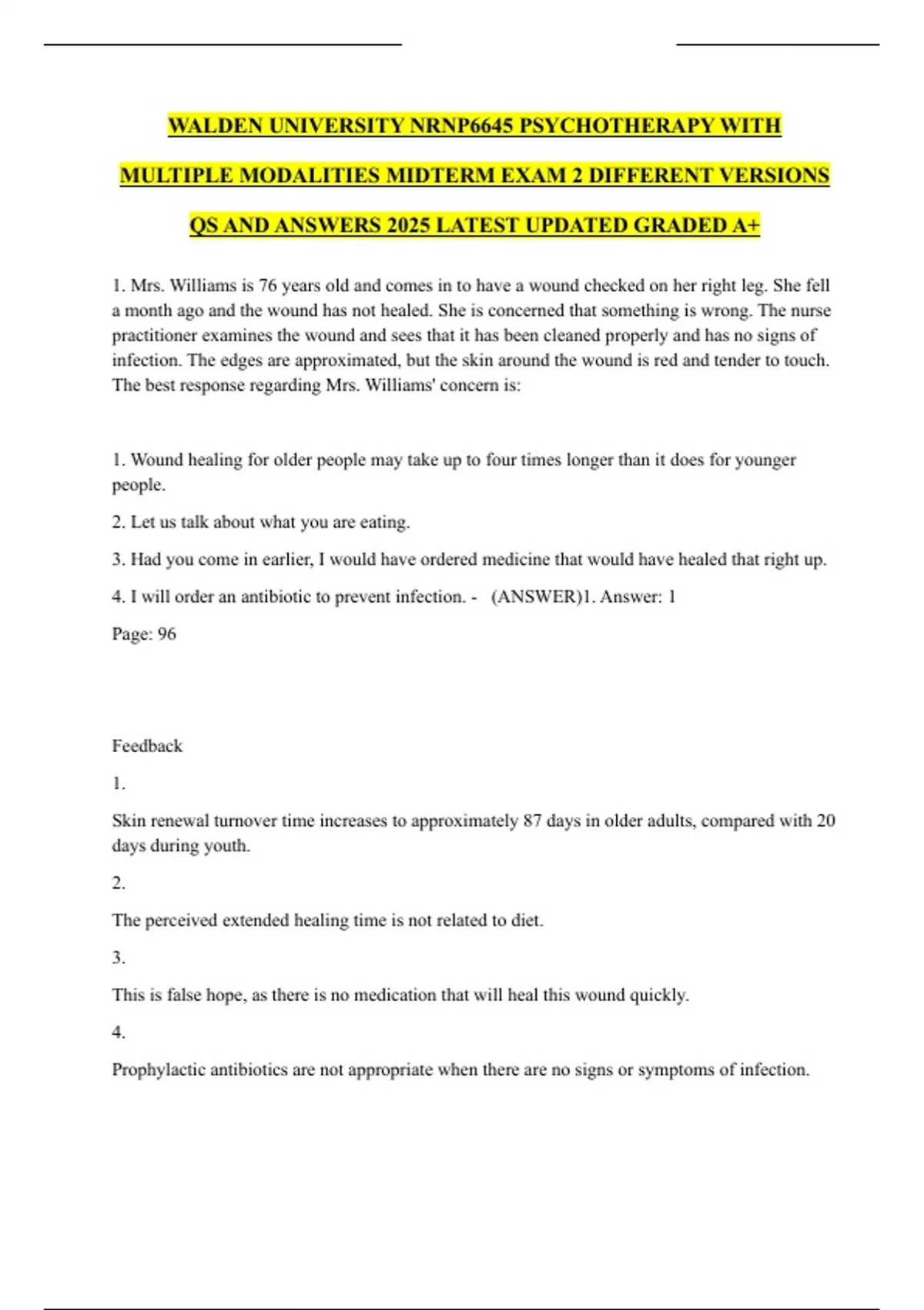 1. Mrs. Williams is 76 years old and comes in to have a wound checked on her right leg. She fell