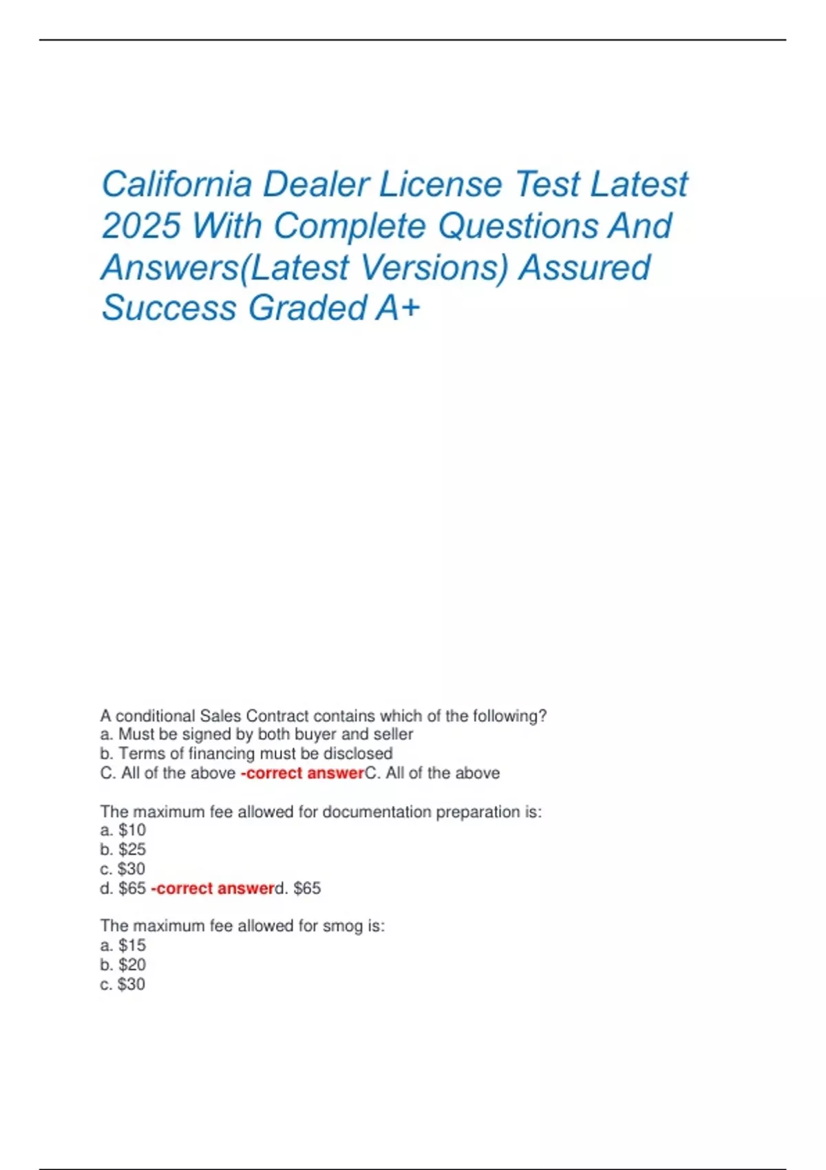 California Dealer License Test Latest 2025 With Complete Questions And Answers(Latest Versions) Assured Success Graded A+