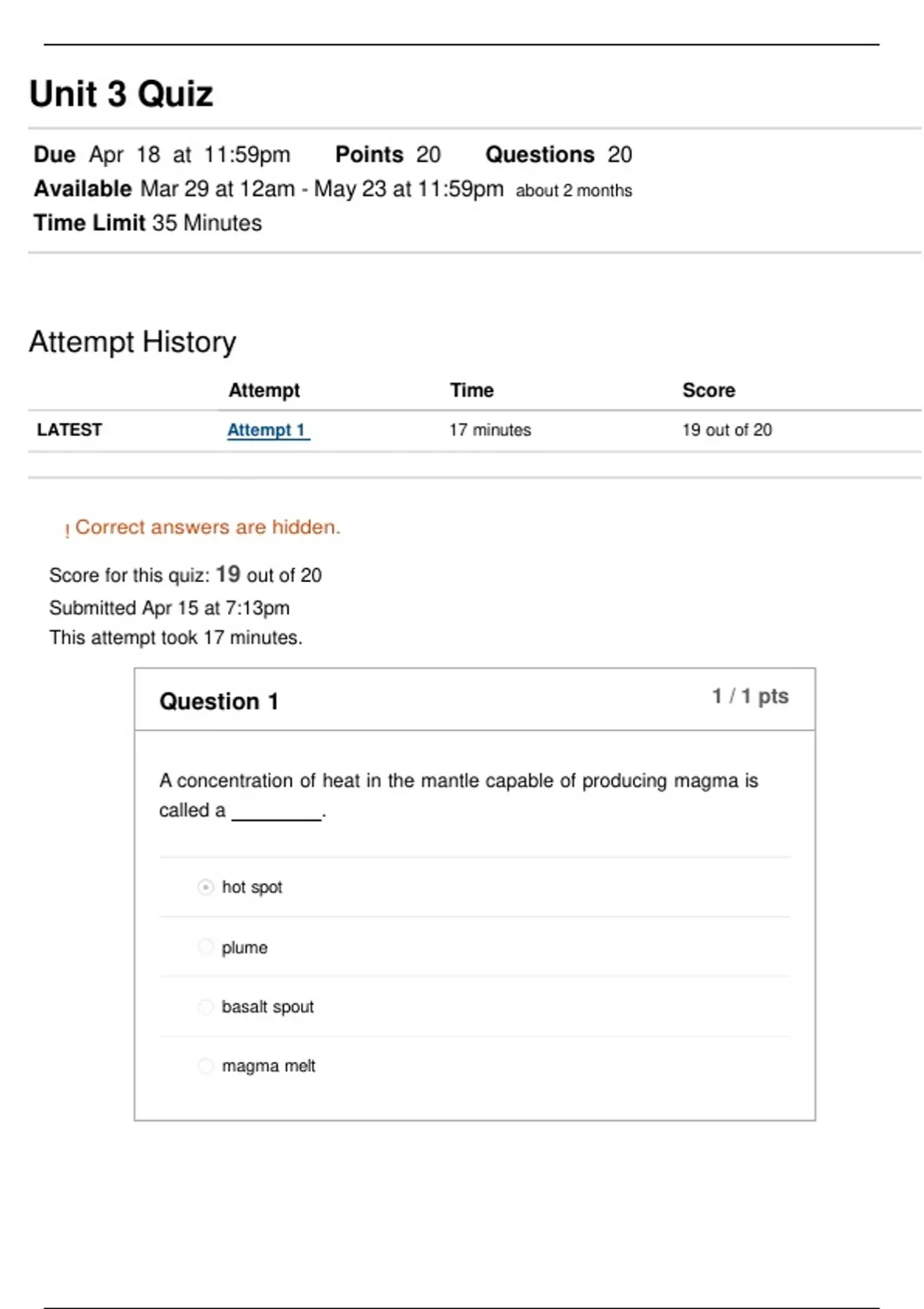 GEL 111 Earth Science - Unit 3 Quiz | Questions and Answers - Score 19/20
