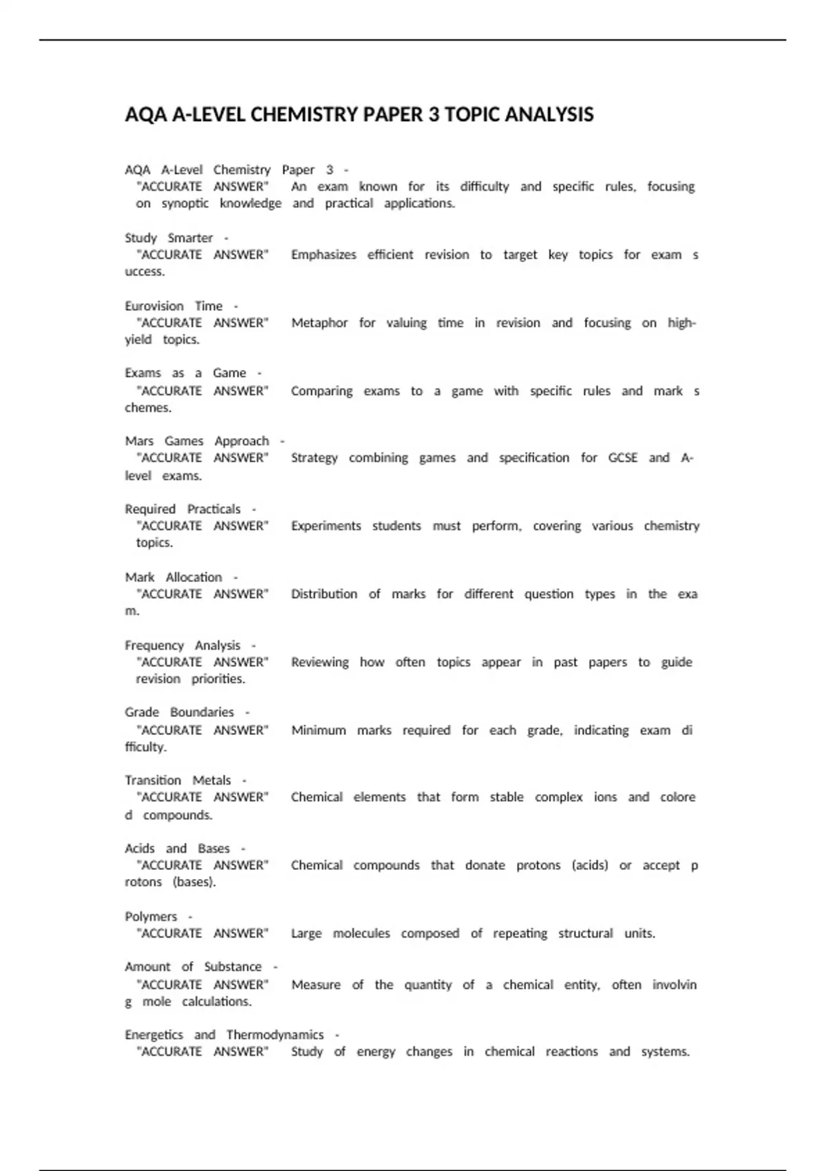 AQA A Level Chemistry Paper 3 Topic Analysis. questions and answers.