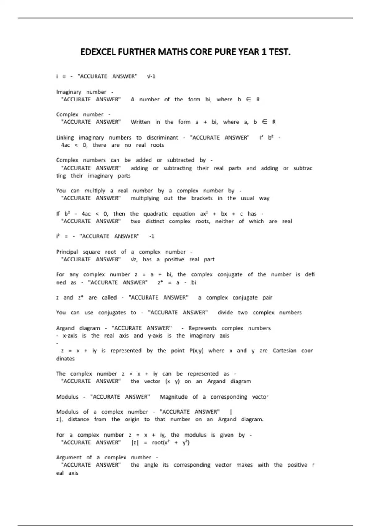 EDEXCEL FURTHER MATHS CORE PURE YEAR 1 Test.