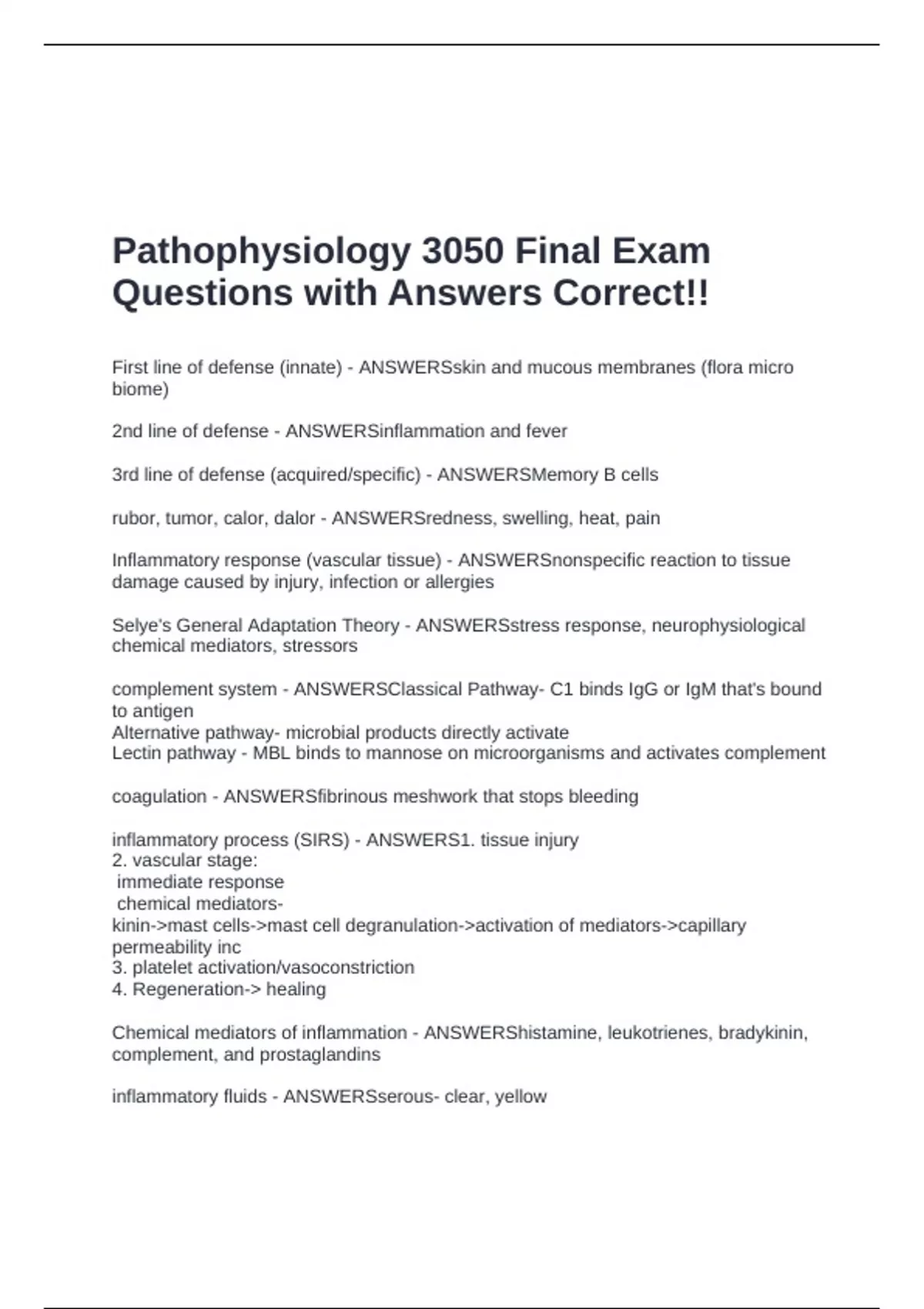 Pathophysiology 3050 Final Exam Questions with Answers Correct!!