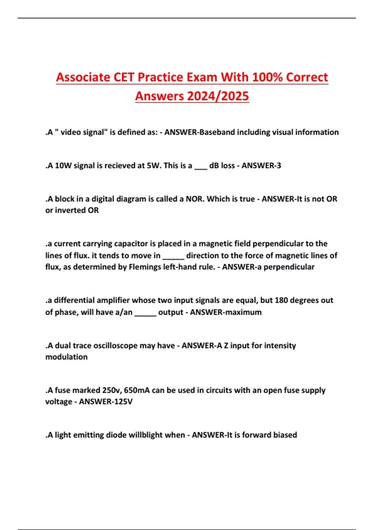 Associate CET Practice Exam With 100% Correct Answers 2024/2025 .A " video signal" is defined as: - ANSWER-Baseband including visual information .A 10W signal is recieved at 5W. This is a ___ dB loss - ANSWER-3 .A block in a digital diagram is called a NOR. Which is true - ANSWER-It is not OR or inverted OR .a current carrying capacitor is placed in a magnetic field perpendicular to the lines of flux. it tends to move in _____ direction to the force of magnetic lines of flux, as determined by Flemings left-hand rule. - ANSWER-a perpendicular .a differential amplifier whose two input signals are equal, but 180 degrees out of phase, will have a/an _____ output - ANSWER-maximum .A dual trace oscilloscope may have - ANSWER-A Z input for intensity modulation .A fuse marked 250v, 650mA can be used in circuits with an open fuse supply voltage - ANSWER-125V .A light emitting diode willblight when - ANSWER-It is forward biased .a mosfet - ANSWER-amplifies signal voltage variations .A pc has conventional RAM and ROM memory area (in a pc it is 0 to 640 kilobytes); upper memory area (640 to 1 meg) and extended memory area ( above 1 megabyte). What other names for internal memory types do pc's have? - ANSWER-Cache .a PLL, or phase-locked-loop circuit, contains a VCO, or voltage-controlled-oscillator. the output of the VCO is a/AN - ANSWER-AC variable frequency signal .A power source such as a generator or battery might be compared to what component in a water supply system - ANSWER-A pump .A ripple counter - ANSWER-Is two or more logical flip-flops connected sequentially with the input pulses toggling the first one.