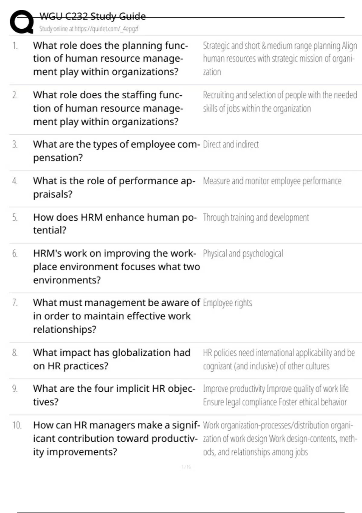 WGU C232 Study Guide Study online at 1. What role does the planning function of human resource management play within organizations? Strategic and short & medium range planning Align human resources with strategic mission of organization 2. What role does the staffing function of human resource management play within organizations? Recruiting and selection of people with the needed skills of jobs within the organization 3. What are the types of employee compensation? Direct and indirect 4. What is the role of performance appraisals? Measure and monitor employee performance