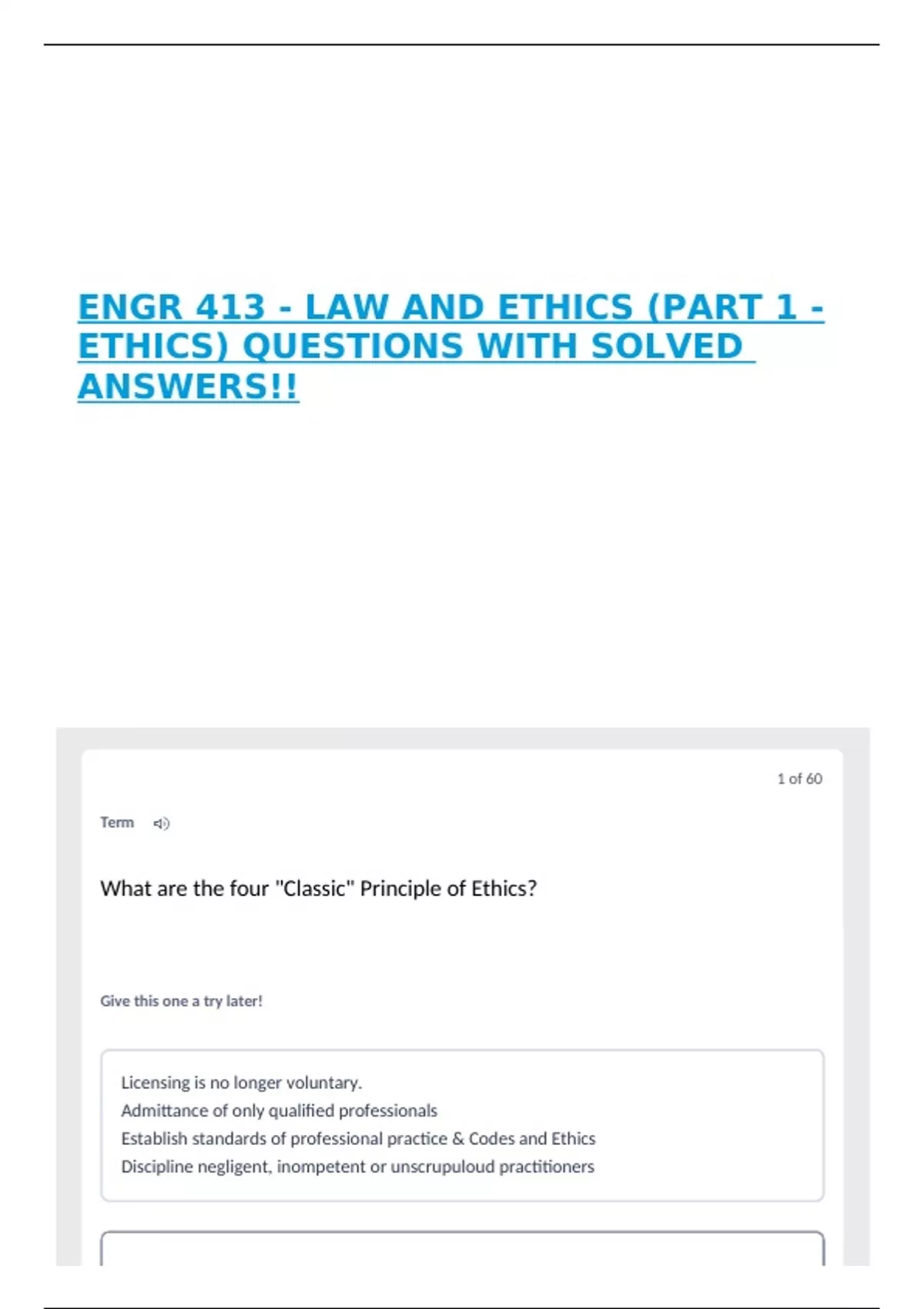 ENGR 413 - LAW AND ETHICS (PART 1 - ETHICS) QUESTIONS WITH SOLVED ANSWERS!!