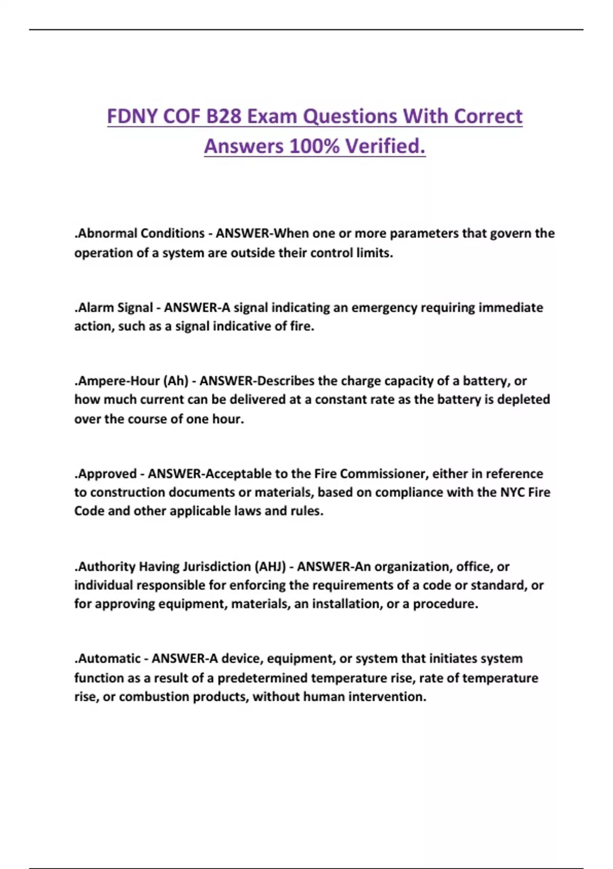 FDNY COF B28 Exam Questions With Correct Answers 100% Verified. .Abnormal Conditions - ANSWER-When one or more parameters that govern the operation of a system are outside their control limits. .Alarm Signal - ANSWER-A signal indicating an emergency requiring immediate action, such as a signal indicative of fire. .Ampere-Hour (Ah) - ANSWER-Describes the charge capacity of a battery, or how much current can be delivered at a constant rate as the battery is depleted over the course of one hour. .Approved - ANSWER-Acceptable to the Fire Commissioner, either in reference to construction documents or materials, based on compliance with the NYC Fire Code and other applicable laws and rules. .Authority Having Jurisdiction (AHJ) - ANSWER-An organization, office, or individual responsible for enforcing the requirements of a code or standard, or for approving equipment, materials, an installation, or a procedure. .Automatic - ANSWER-A device, equipment, or system that initiates system function as a result of a predetermined temperature rise, rate of temperature rise, or combustion products, without human intervention. .Battery Module - ANSWER-A module consisting of a number of cells generally connected in either series or parallel. .Battery Rack - ANSWER-A device used to vertically store battery modules. .Battery String - ANSWER-A number of cells/batteries connected in series to produce a battery or battery string with the required usable voltage/potential, e.g., 6V, 12V, 24V, 48V, 110V. .Cell - ANSWER-A single connection between the plates and electrolyte which produces a specific voltage. .Central Station - ANSWER-A facility that receives alarm signals from a protected premises and re-transmits or otherwise reports such alarm signals to the Fire Department. .Central Station - ANSWER-A facility that receives alarm signals from a protected premises and re-transmits or reports these signals to the Fire Department. .Certificate of Approval - ANSWER-A written statement issued by the FDNY commissioner certifying that an article, device, or equipment has been examined, tested, and approved for specific use in conformity with the Fire Code or Fire Department Rules.