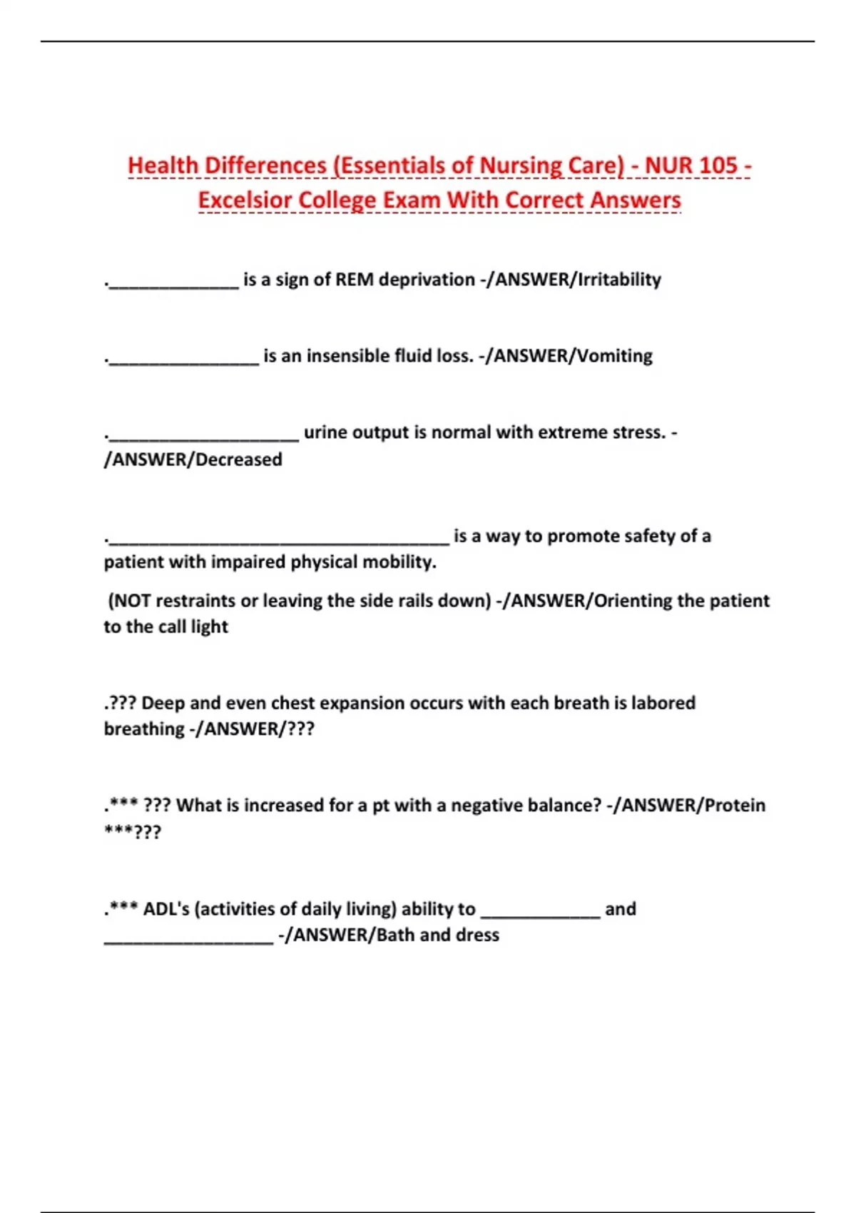Health Differences (Essentials of Nursing Care) - NUR 105 - Excelsior College Exam With Correct Answers ._____________ is a sign of REM deprivation -/ANSWER/Irritability ._______________ is an insensible fluid loss. -/ANSWER/Vomiting .___________________ urine output is normal with extreme stress. -/ANSWER/Decreased .__________________________________ is a way to promote safety of a patient with impaired physical mobility. (NOT restraints or leaving the side rails down) -/ANSWER/Orienting the patient to the call light .??? Deep and even chest expansion occurs with each breath is labored breathing -/ANSWER/??? .*** ??? What is increased for a pt with a negative balance? -/ANSWER/Protein ***??? .*** ADL's (activities of daily living) ability to ____________ and _________________ -/ANSWER/Bath and dress .***??? A catheter is inserted if you have how much residual urine? -/ANSWER/50cc ***??? .***???*** What is common in hyperkalemia and hypokalemia? -/ANSWER/***???*** Bradycardia .***???Abdominal cramping and large doses of baking soda. -/ANSWER/Metabolic alkalosis***??? .*****?? What food is recommended for an 8yr old patient who is at risk for constipation? -/ANSWER/Popcorn **???** .A draining intestinal fistula can cause what electrolyte imbalance? -/ANSWER/Hyperkalemia .A fleets enema is a _______________ enema. -/ANSWER/Hypertonic .A Foley bad should always be kept where on the patient? -/ANSWER/Below the bladder level. .A good source of complete protein -/ANSWER/Eggs .A grayish-blue cast to the skin around the mouth is called what? -/ANSWER/Cyanosis .A patient with metabolic acidosis will have what? -/ANSWER/Nausea and vomiting .A pt with high cholesterol levels should eat what kind of fats? -/ANSWER/Polyunsturated .A pt. in metabolic acidosis will be given _________. -/ANSWER/1/2 NS .A side effect of Diuril is _________________. -/ANSWER/Hypochloremia .Abnormally large amounts of urine is called -/ANSWER/Polyuria