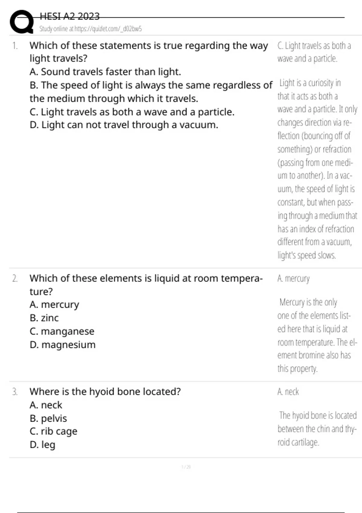 HESI A2 2023 Study online at 1. Which of these statements is true regarding the way light travels? A. Sound travels faster than light. B. The speed of light is always the same regardless of the medium through which it travels. C. Light travels as both a wave and a particle. D. Light can not travel through a vacuum. C. Light travels as both a wave and a particle. Light is a curiosity in that it acts as both a wave and a particle. It only changes direction via reflection (bouncing off of something) or refraction (passing from one medium to another). In a vacuum, the speed of light is constant, but when passing through a medium that has an index of refraction different from a vacuum, light's speed slows.