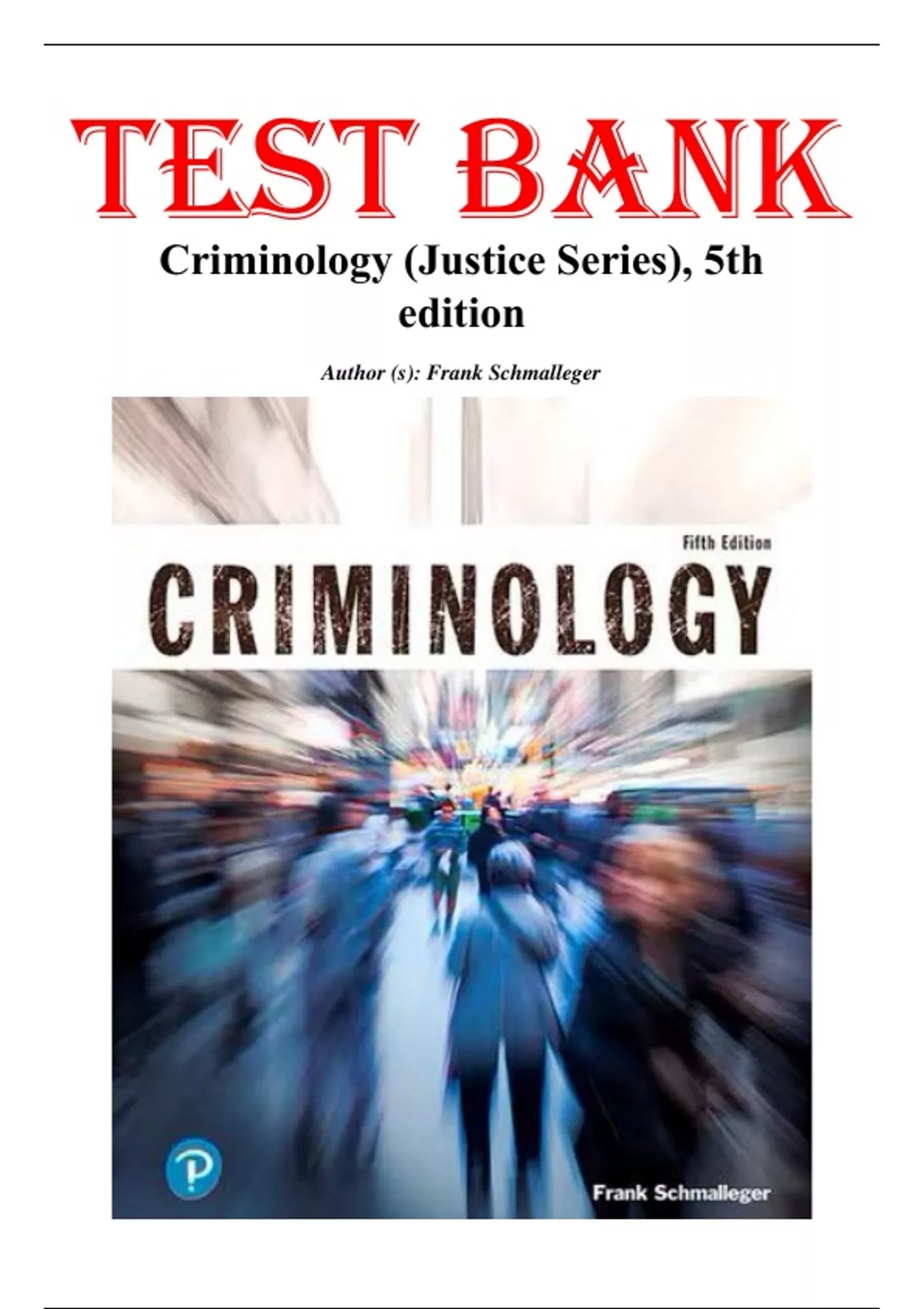 Test Bank - Criminology (Justice Series) 5th Edition By Frank Schmalleger, Chapters 1-15. Full Chapters Include;....PART I. CRIMINOLOGY EXPLAINED — THE EVIL MEN (AND WOMEN) DO What Is Criminology? — Understanding Crime and Criminals PART II. CRIME CAUSATION — WHAT WE DO AND WHY WE DO IT Classical and Neoclassical Criminology — Choice and Consequences Early Biological Perspectives on Criminal Behavior — It's What We Are Biosocial and Other Contemporary Perspectives — Interaction Is Key Psychological and Psychiatric Foundations of Criminal Behavior — It's How We Think Social Structure — It's Where and How We Live Social Process and Social Development — It's What We Learn Social Conflict and Emergent Theories — It's How We Relate PART III. THE CRIME PICTURE — IT's NOT PRETTY Criminal Victimization — It's Personal Crimes against Persons-What We Fear Crimes against Property — It's What We Lose White-Collar and Organized Crime — Crime as a Job Drug and Sex Crimes — Recreational Offenses PART IV. CRIME IN THE MODERN WORLD — TODAY's HEADLINES Technology and Crime — It's a Double-Edged Sword Globalization and Terrorism — Our Small World