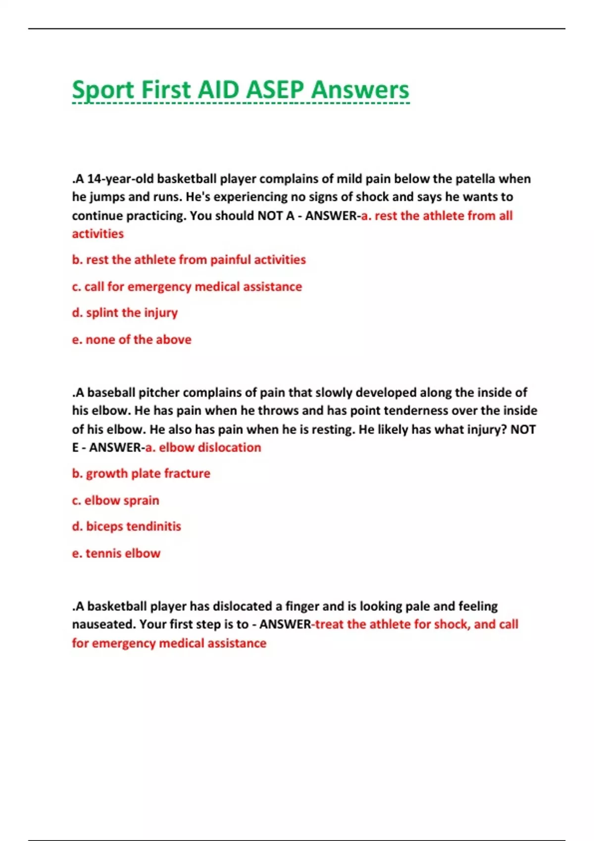 Sport First AID ASEP Answers .A 14-year-old basketball player complains of mild pain below the patella when he jumps and runs. He's experiencing no signs of shock and says he wants to continue practicing. You should NOT A - ANSWER-a. rest the athlete from all activities b. rest the athlete from painful activities c. call for emergency medical assistance d. splint the injury e. none of the above .A baseball pitcher complains of pain that slowly developed along the inside of his elbow. He has pain when he throws and has point tenderness over the inside of his elbow. He also has pain when he is resting. He likely has what injury? NOT E - ANSWER-a. elbow dislocation b. growth plate fracture c. elbow sprain d. biceps tendinitis e. tennis elbow .A basketball player has dislocated a finger and is looking pale and feeling nauseated. Your first step is to - ANSWER-treat the athlete for shock, and call for emergency medical assistance .A basketball player has dislocated a finger and is looking pale and feeling nauseated. Your first step is to. NOT C - ANSWER-a. apply ice, and then send the athlete to a physician b. place the athlete on her side, and cover her with a blanket c. splint the finger, apply ice, and send her to a physician d. treat the athlete for shock, and call for emergency medical assistance e. do none of the above .A basketball player is hit on the end of her thumb with the ball. The thumb does not have a deformity, but the athlete is in a great deal of pain. Which of the following symptoms and signs would lead you to send for emergency medical assistance? NOT B - ANSWER-a. She has pain when you tap the end of her thumb. b. She is experiencing shock. c. She has disrupted circulation in her thumb. d. all of the above e. b and c .A coach could be held liable if an athlete is injured while using inappropriately fitted protective equipment. - ANSWER-True .A cross country athlete is severely allergic to bees and has asthma. If she is having difficulty breathing, what other sign or symptom would help determine whether she is suffering from asthma or experiencing anaphylactic shock? - ANSWER-swollen lips, tongue, or throat