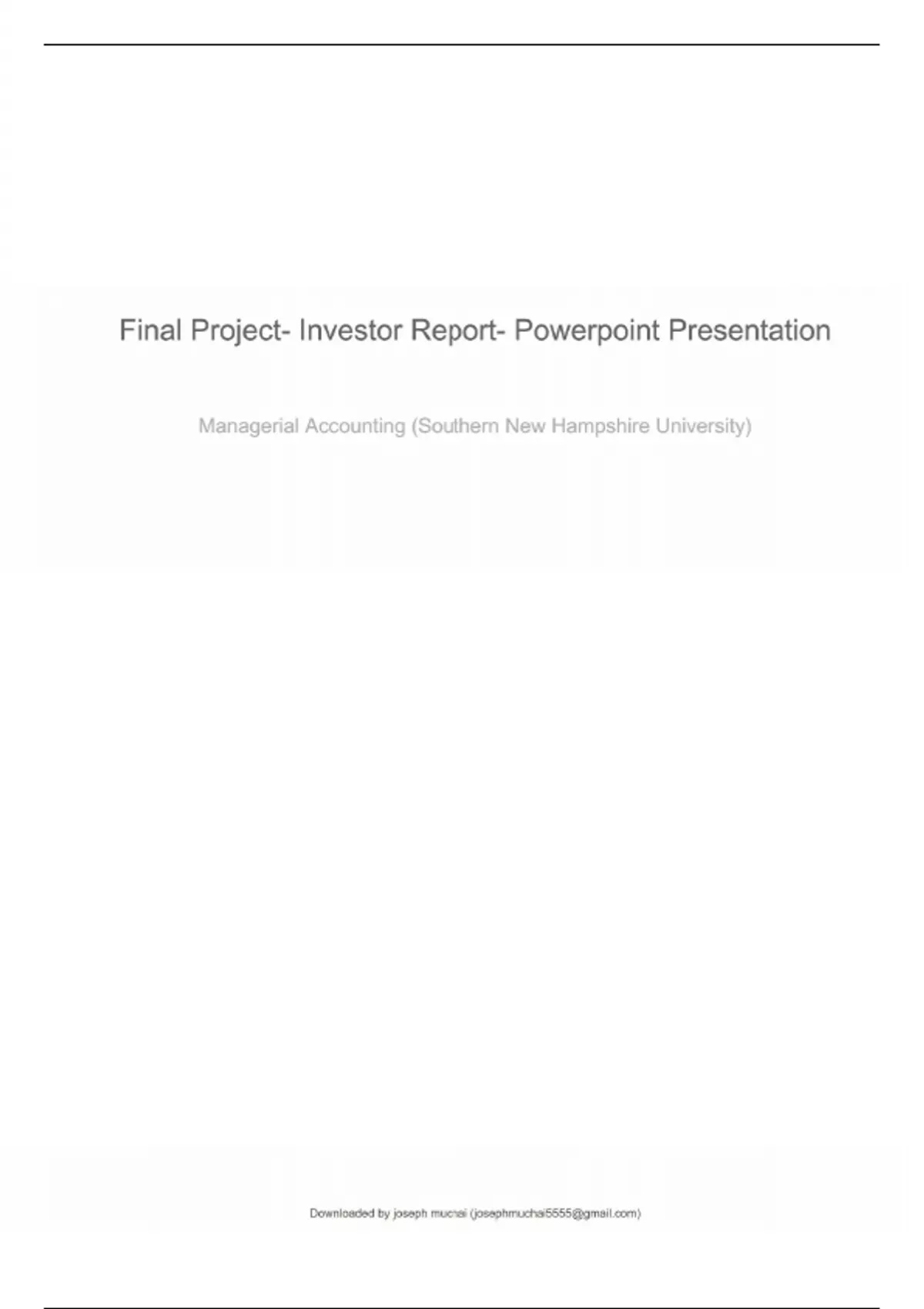 The Final Project – Investor Report – PowerPoint Presentation for ACC 202 provides a comprehensive, visual summary of financial analysis and investment recommendations. This presentation includes key insights from ratio analysis, profitability evaluation, and financial health assessment of a business. It’s ideal for students looking to create a professional, visually engaging report that supports their findings and enhances their academic projects. This PowerPoint presentation serves as a valuable resource for preparing and presenting the investor report in ACC 202.