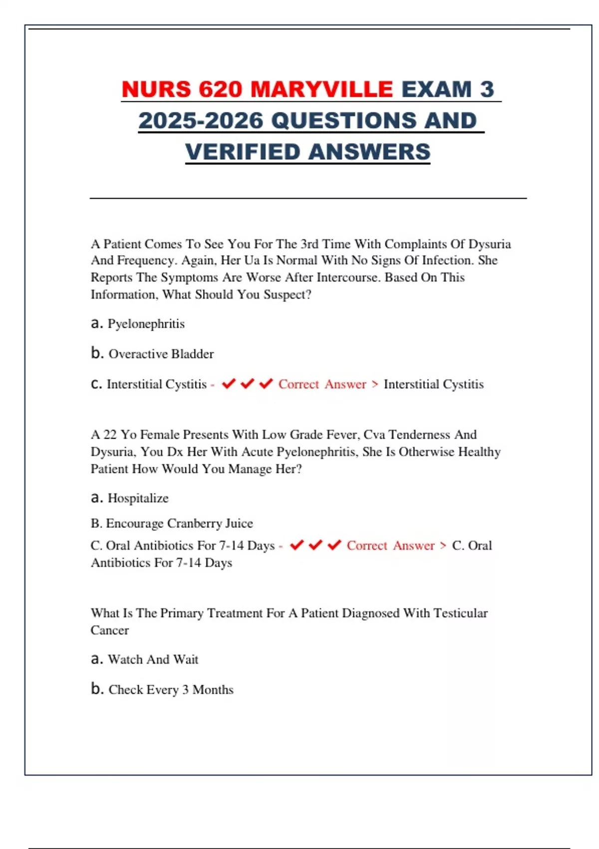 c. Interstitial Cystitis - ✔✔✔ Correct Answer > Interstitial Cystitis