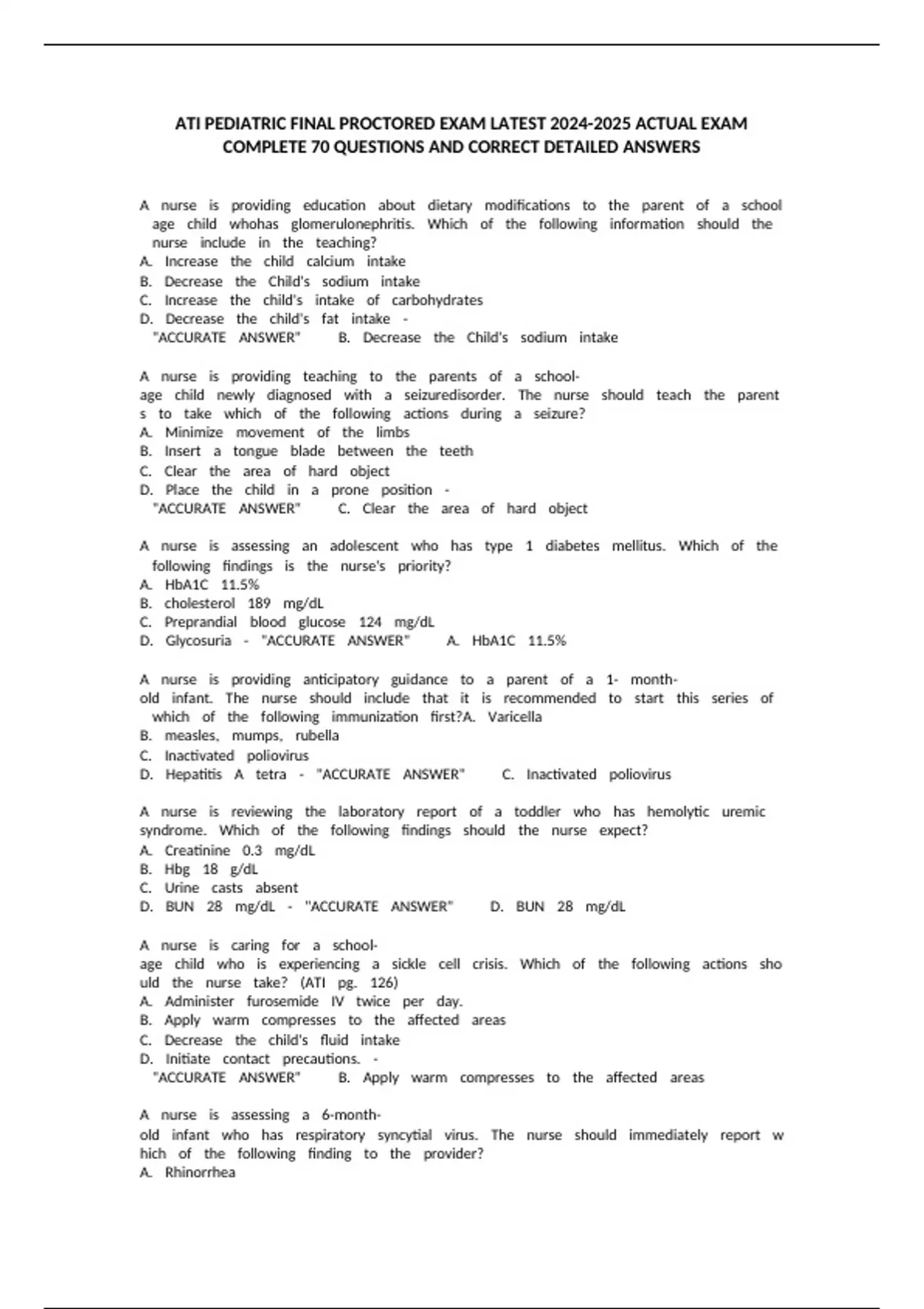 ATI PEDIATRIC FINAL PROCTORED EXAM LATEST 2024-2025 ACTUAL EXAM