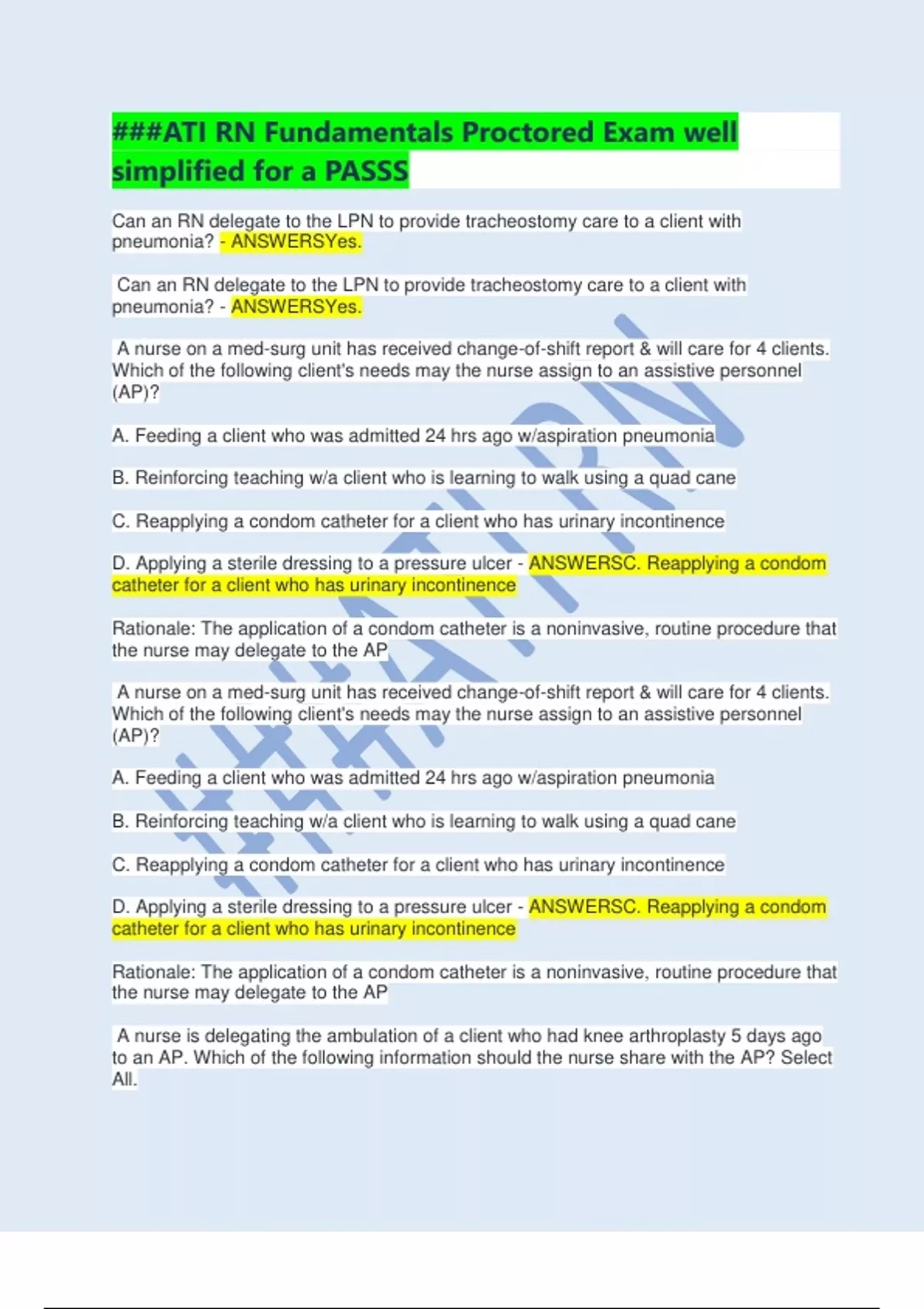 ###ATI RN Fundamentals Proctored Exam well simplified for a PASSS Can an RN delegate to the LPN to provide tracheostomy care to a client with pneumonia? - ANSWERSYes. Can an RN delegate to the LPN to provide tracheostomy care to a client with pneumonia? - ANSWERSYes. A nurse on a med-surg unit has received change-of-shift report & will care for 4 clients. Which of the following client's needs may the nurse assign to an assistive personnel (AP)? A. Feeding a client who was admitted 24 hrs ago w/aspiration pneumonia B. Reinforcing teaching w/a client who is learning to walk using a quad cane C. Reapplying a condom catheter for a client who has urinary incontinence D. Applying a sterile dressing to a pressure ulcer - ANSWERSC. Reapplying a condom catheter for a client who has urinary incontinence Rationale: The application of a condom catheter is a noninvasive, routine procedure that the nurse may delegate to the AP A nurse on a med-surg unit has received change-of-shift report & will care for 4 clients. Which of the following client's needs may the nurse assign to an assistive personnel (AP)? A. Feeding a client who was admitted 24 hrs ago w/aspiration pneumonia B. Reinforcing teaching w/a client who is learning to walk using a quad cane C. Reapplying a condom catheter for a client who has urinary incontinence D. Applying a sterile dressing to a pressure ulcer - ANSWERSC. Reapplying a condom catheter for a client who has urinary incontinence Rationale: The application of a condom catheter is a noninvasive, routine procedure that the nurse may delegate to the AP A nurse is delegating the ambulation of a client who had knee arthroplasty 5 days ago to an AP. Which of the following information should the nurse share with the AP? Select All. A. The roommate is up independently. B. The client ambulates w/his slippers on over his antiembolic stockings C. The client uses a front-wheeled walker when ambulating D. The client had pain medication 30 min ago E. The client is allergic to codeine F. The client ate 50% of his breakfast this morning - ANSWERSB, C, D A nurse is delegating the ambulation of a client who had knee arthroplasty 5 days ago to an AP. Which of the following information should the nurse share with the AP? Select All. A. The roommate is up independently. B. The client ambulates w/his slippers on over his antiembolic stockings C. The client uses a front-wheeled walker when ambulating D. The client had pain medication 30 min ago E. The client is allergic to codeine F. The client ate 50% of his breakfast this morning - ANSWERSB, C, D An RN is making assignments for client care to a LPN at the beginning of the shift. Which of the following assignments should the LPN question? A. Assisting a client who is 24hr postop to use an incentive spirometer B. Collecting a clean-catch urine specimen from a client who was admitted on the previous shift C. Providing nasopharyngeal suctioning for a client who has pneumonia D. Replacing the cartridge and tubing on a PCA pump - ANSWERSD. Replacing the cartridge and tubing on a PCA pump Rationale: The RN is responsible for the PCA pump An RN is making assignments for client care to a LPN at the beginning of the shift. Which of the following assignments should the LPN question? A. Assisting a client who is 24hr postop to use an incentive spirometer B. Collecting a clean-catch urine specimen from a client who was admitted on the previous shift C. Providing nasopharyngeal suctioning for a client who has pneumonia D. Replacing the cartridge and tubing on a PCA pump - ANSWERSD. Replacing the cartridge and tubing on a PCA pump Rationale: The RN is responsible for the PCA pump A nurse is preparing an in-service program about delegation. Which of the following elements should she identify when presenting the 5 rights of delegation? Select all. A. Right client B. Right supervision/evaluation C. Right direction/communication D. Right time E. Right circumstances - ANSWERSB, C, E A and D are rights of medication administration A nurse is preparing an in-service program about delegation. Which of the following elements should she identify when presenting the 5 rights of delegation? Select all. A. Right client B. Right supervision/evaluation C. Right direction/communication D. Right time E. Right circumstances - ANSWERSB, C, E A and D are rights of medication administration A nurse manager of a med-surg unit is assigning care responsibilities for the oncoming shift. A client is awaiting transfer back to the unit from the PACU following thoracic surgery. To which staff member should the nurse assign to this client? A. Charge nurse B. RN C. LPN D. AP - ANSWERSB. RN A client returning from surgery requires assessment and establishment of a plan of care. RNs are responsible for this, especially if the client is potentially unstable. A nurse manager of a med-surg unit is assigning care responsibilities for the oncoming shift. A client is awaiting transfer back to the unit from the PACU following thoracic surgery. To which staff member should the nurse assign to this client? A. Charge nurse B. RN C. LPN D. AP - ANSWERSB. RN A client returning from surgery requires assessment and establishment of a plan of care. RNs are responsible for this, especially if the client is potentially unstable. A nurse observes an AP reprimanding a client for not using the urinal properly. The AP tells him she will put a diaper on him if he does not use the urinal more carefully next time. Which of the following torts is the AP committing?