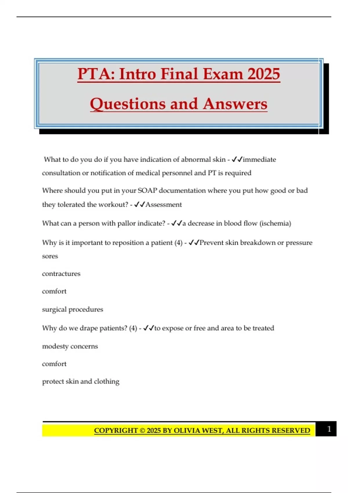Comprehensive PTA Intro Final Exam 2025 questions and answers focused on foundational concepts, ethics, supervision, documentation, and APTA guidelines.