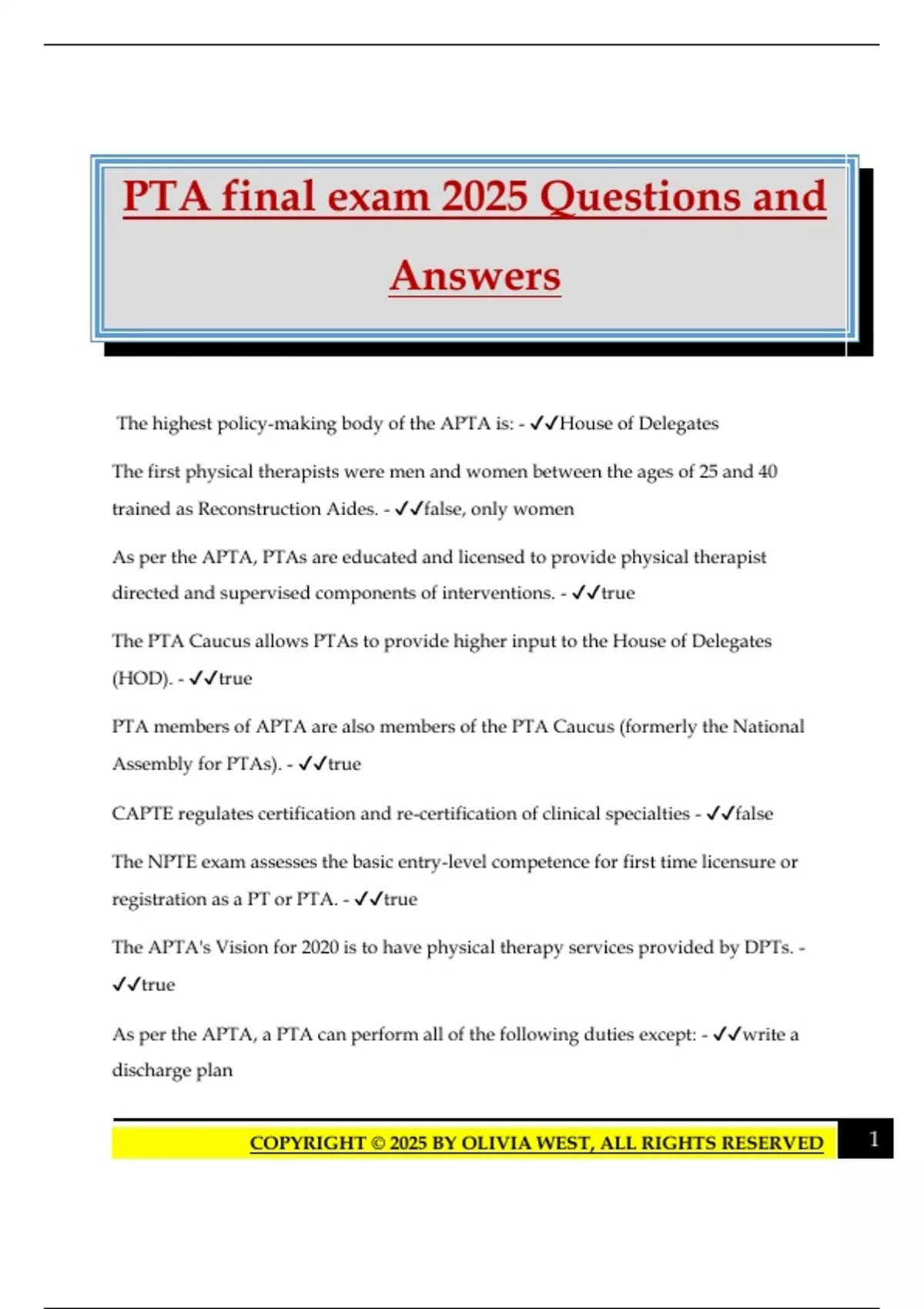 Detailed PTA Final Exam 2025 questions and answers covering essential topics such as clinical skills, patient care, ethics, and documentation.