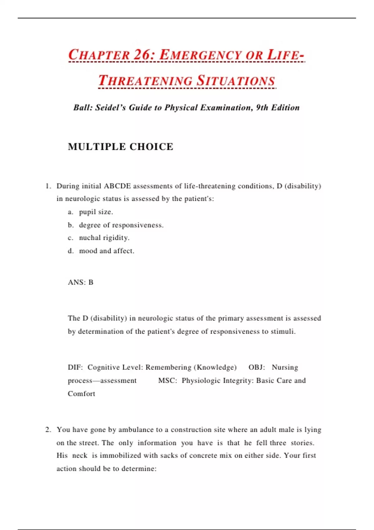 1. During initial ABCDE assessments of life-threatening conditions, D (disability)