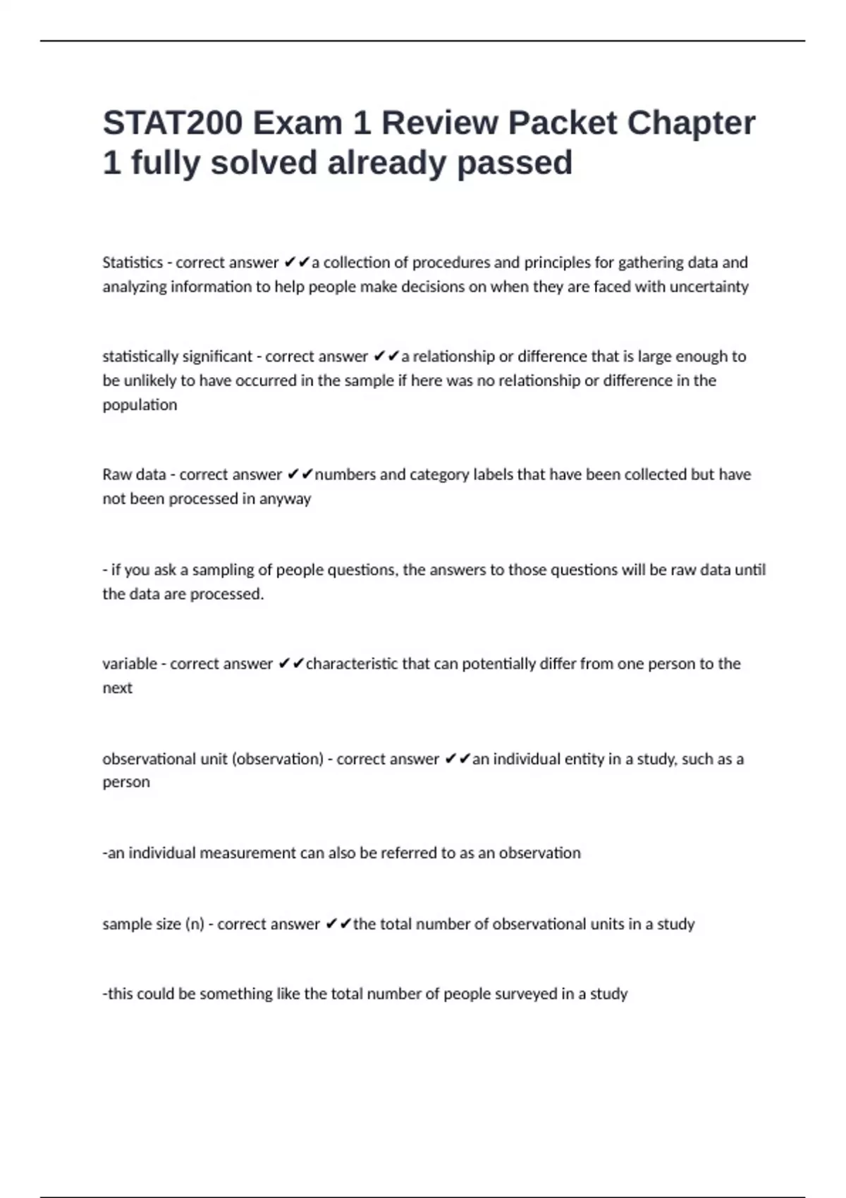 STAT200 Exam 1 Review Packet Chapter 1 fully solved already passed