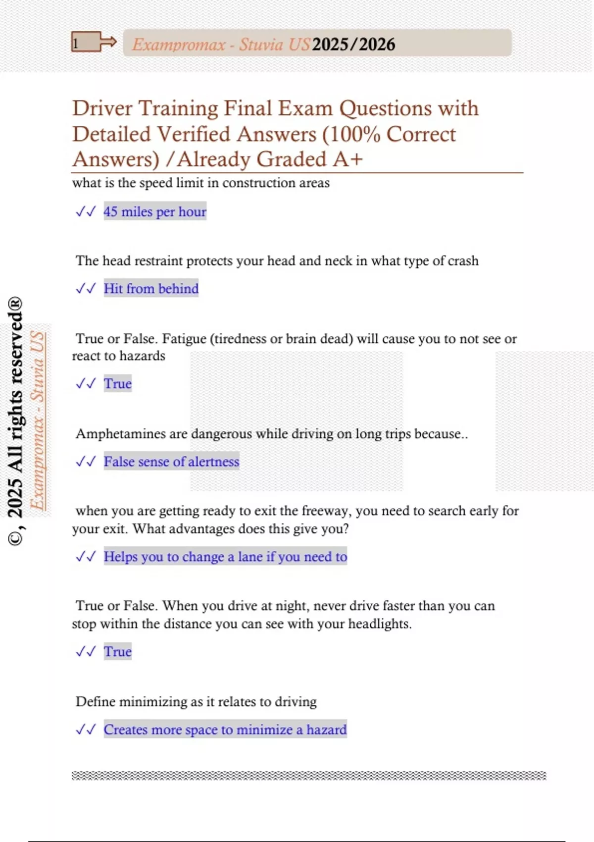 Driver Training Final Exam Questions with Detailed Verified Answers (100% Correct Answers) /Already Graded A+