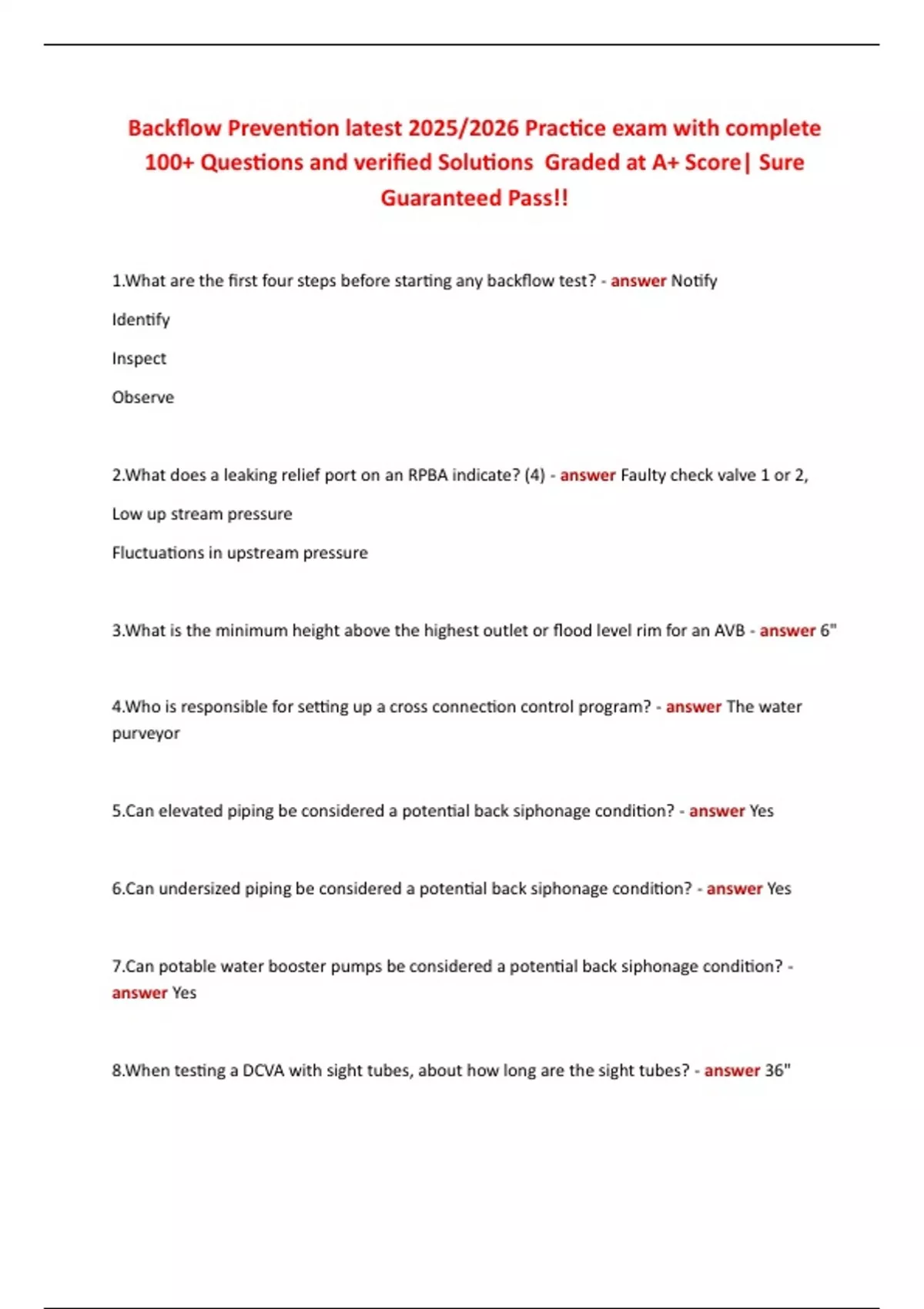 Backflow Prevention latest 2025/2026 Practice exam with complete 100+ Questions and verified Solutions Graded at A+ Score| Sure Guaranteed Pass!!