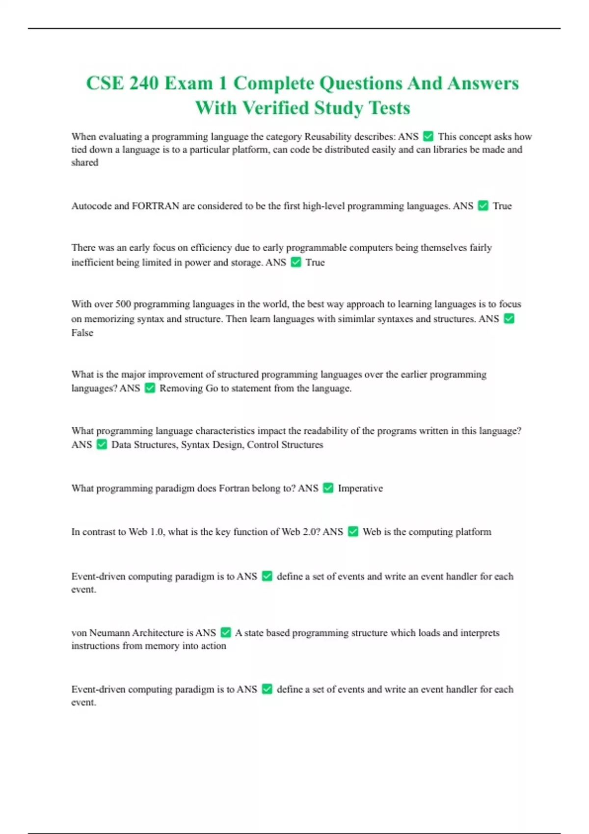 CSE 240 Exam 1 Complete Questions And Answers With Verified Study Tests