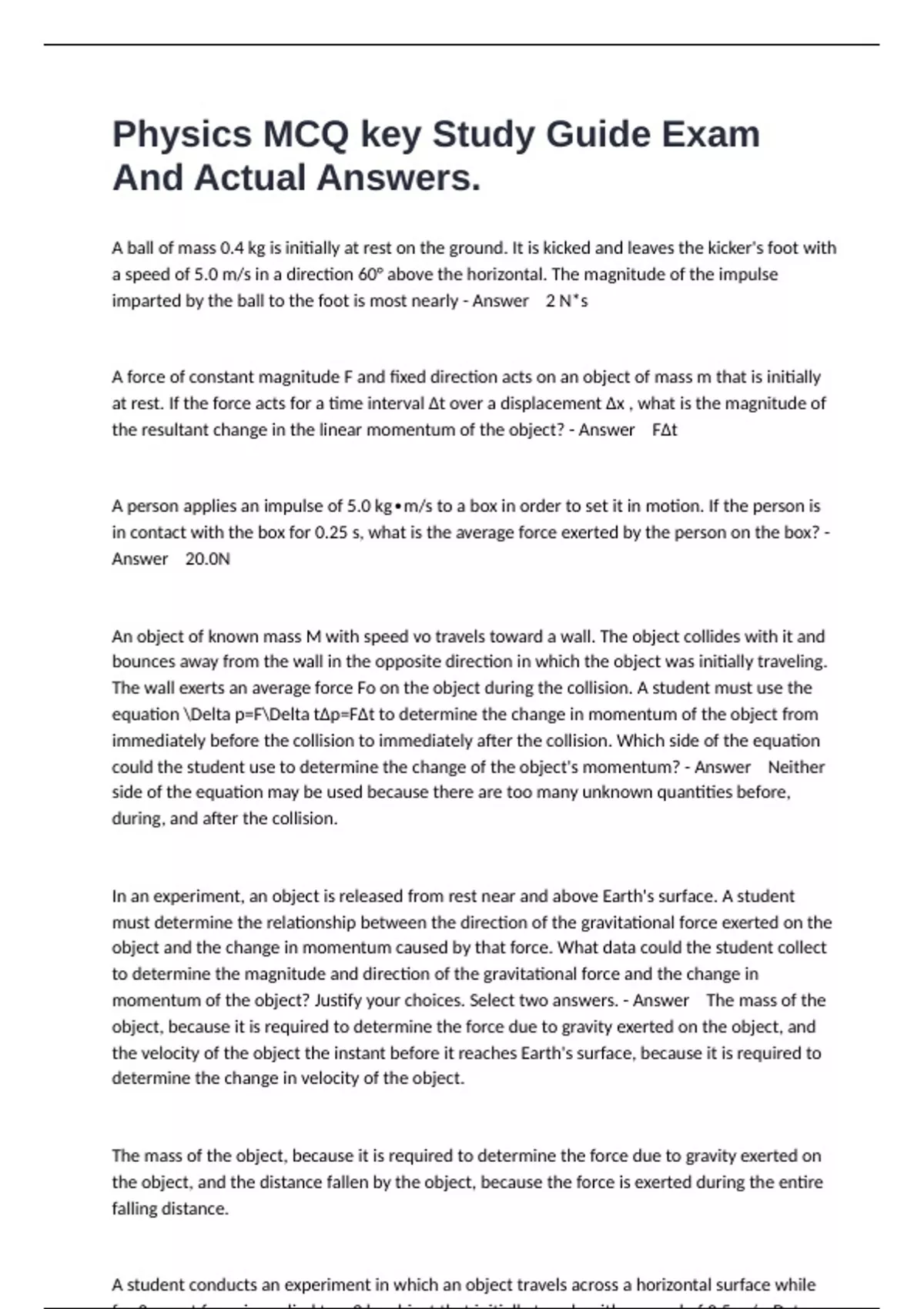 A ball of mass 0.4 kg is initially at rest on the ground. It is kicked and leaves the kicker's foot with a speed of 5.0 m/s in a direction 60° above the horizontal. The magnitude of the impulse imparted by the ball to the foot is most nearly - Answer 2 N*s A force of constant magnitude F and fixed direction acts on an object of mass m that is initially at rest. If the force acts for a time interval ∆t over a displacement ∆x , what is the magnitude of the resultant change in the linear momentum of the object? - Answer FΔt A person applies an impulse of 5.0 kg∙m/s to a box in order to set it in motion. If the person is in contact with the box for 0.25 s, what is the average force exerted by the person on the box? - Answer 20.0N An object of known mass M with speed vo travels toward a wall. The object collides with it and bounces away from the wall in the opposite direction in which the object was initially traveling. The wall exerts an average force Fo on the object during the collision. A student must use the equation Delta p=FDelta tΔp=FΔt to determine the change in momentum of the object from immediately before the collision to immediately after the collision. Which side of the equation could the student use to determine the change of the object's momentum? - Answer Neither side of the equation may be used because there are too many unknown quantities before, during, and after the collision. In an experiment, an object is released from rest near and above Earth's surface. A student must determine the relationship between the direction of the gravitational force exerted on the object and the change in momentum caused by that force. What data could the student collect to determine the magnitude and direction of the gravitational force and the change in momentum of the object? Justify your choices. Select two answers. - Answer The mass of the object, because it is required to determine the force due to gravity exerted on the object, and the velocity of the object the instant before it reaches Earth's surface, because it is required to determine the change in velocity of the object. The mass of the object, because it is required to determine the force due to gravity exerted on the object, and the distance fallen by the object, because the force is exerted during the entire falling distance. A student conducts an experiment in which an object travels across a horizontal surface while for 2s a net force is applied to a 2 kg object that initially travels with a speed of 0.5 m/s. Data collected from the experiment are used to create the graph of the magnitude of the applied force exerted on the object as a function of time is shown. All frictional forces are considered to be negligible. Can the student use the graph and the known data to determine the momentum of the object after the force has been applied? - Answer No, because the student needs to