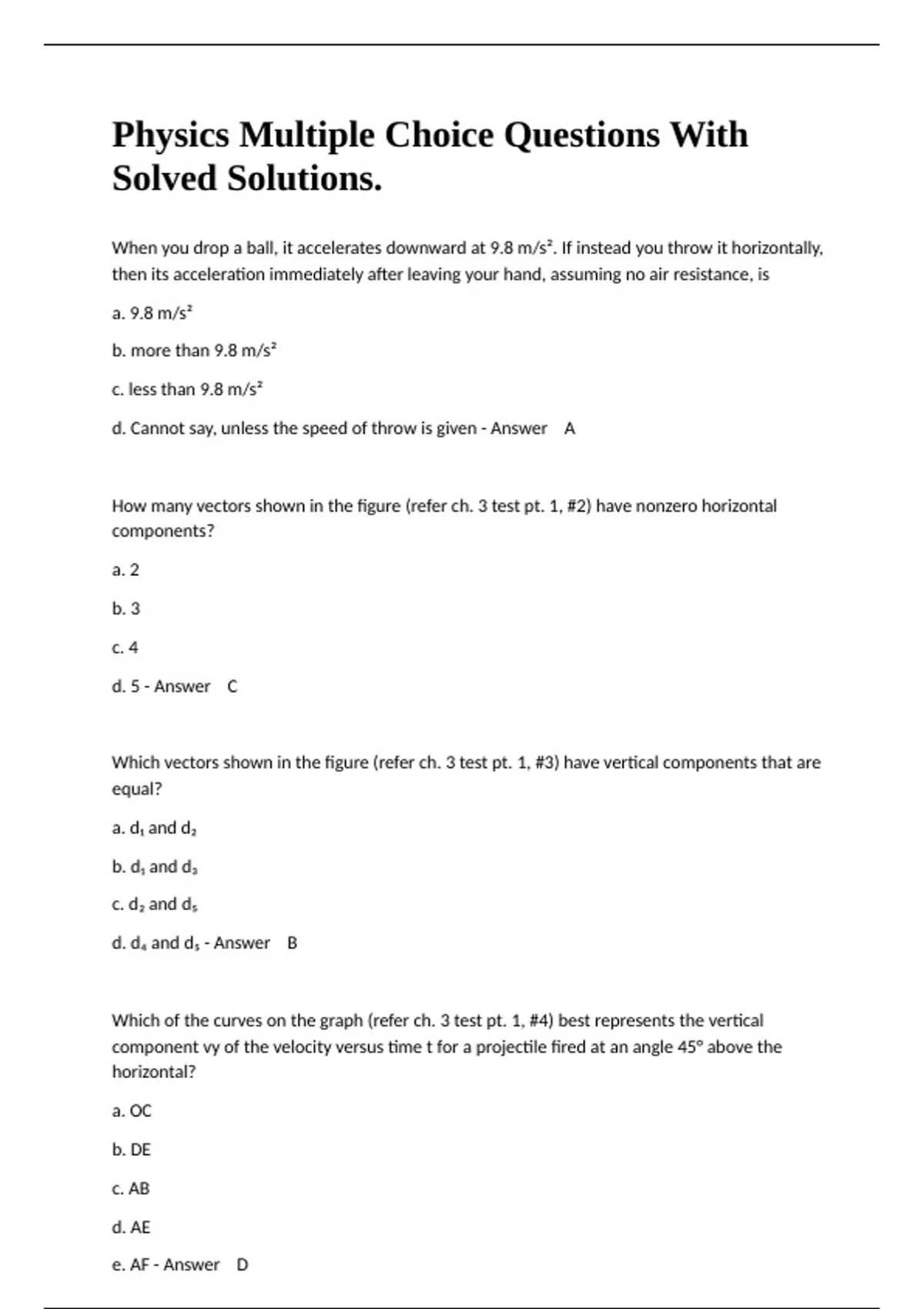 When you drop a ball, it accelerates downward at 9.8 m/s². If instead you throw it horizontally, then its acceleration immediately after leaving your hand, assuming no air resistance, is a. 9.8 m/s² b. more than 9.8 m/s² c. less than 9.8 m/s² d. Cannot say, unless the speed of throw is given - Answer A How many vectors shown in the figure (refer ch. 3 test pt. 1, #2) have nonzero horizontal components? a. 2 b. 3 c. 4 d. 5 - Answer C Which vectors shown in the figure (refer ch. 3 test pt. 1, #3) have vertical components that are equal? a. d₁ and d₂ b. d₁ and d₃ c. d₂ and d₅ d. d₄ and d₅ - Answer B Which of the curves on the graph (refer ch. 3 test pt. 1, #4) best represents the vertical component vy of the velocity versus time t for a projectile fired at an angle 45° above the horizontal? a. OC b. DE c. AB d. AE e. AF - Answer D Which of the curves on the graph best represents the horizontal component vx of the velocity versus time t for a projectile fired at an angle 45° above the horizontal? a. OC