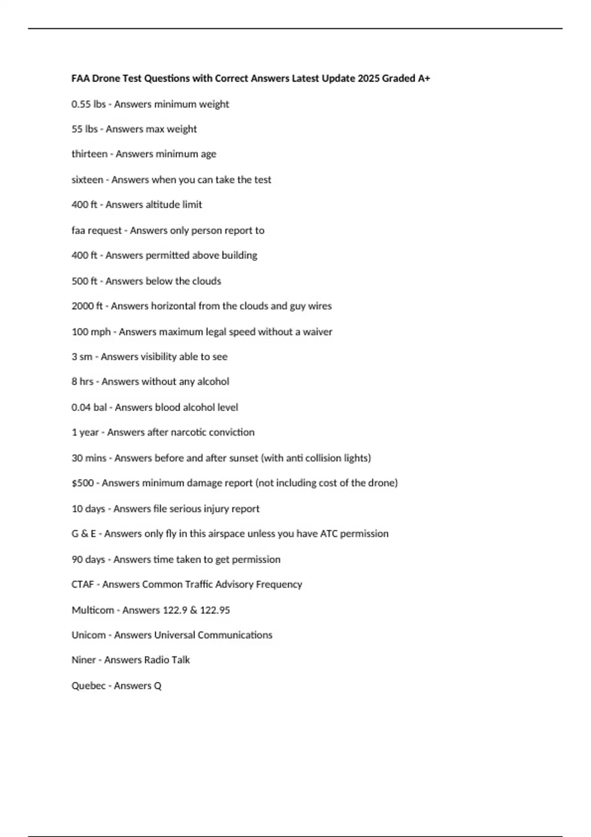 FAA Drone Test Questions with Correct Answers Latest Update 2025 Graded A+ 0.55 lbs - Answers minimum weight 55 lbs - Answers max weight thirteen - Answers minimum age sixteen - Answers when you can take the test 400 ft - Answers altitude limit faa request - Answers only person report to 400 ft - Answers permitted above building 500 ft - Answers below the clouds 2000 ft - Answers horizontal from the clouds and guy wires 100 mph - Answers maximum legal speed without a waiver 3 sm - Answers visibility able to see 8 hrs - Answers without any alcohol 0.04 bal - Answers blood alcohol level 1 year - Answers after narcotic conviction 30 mins - Answers before and after sunset (with anti collision lights) $500 - Answers minimum damage report (not including cost of the drone) 10 days - Answers file serious injury report G & E - Answers only fly in this airspace unless you have ATC permission 90 days - Answers time taken to get permission CTAF - Answers Common Traffic Advisory Frequency Multicom - Answers 122.9 & 122.95 Unicom - Answers Universal Communications Niner - Answers Radio Talk