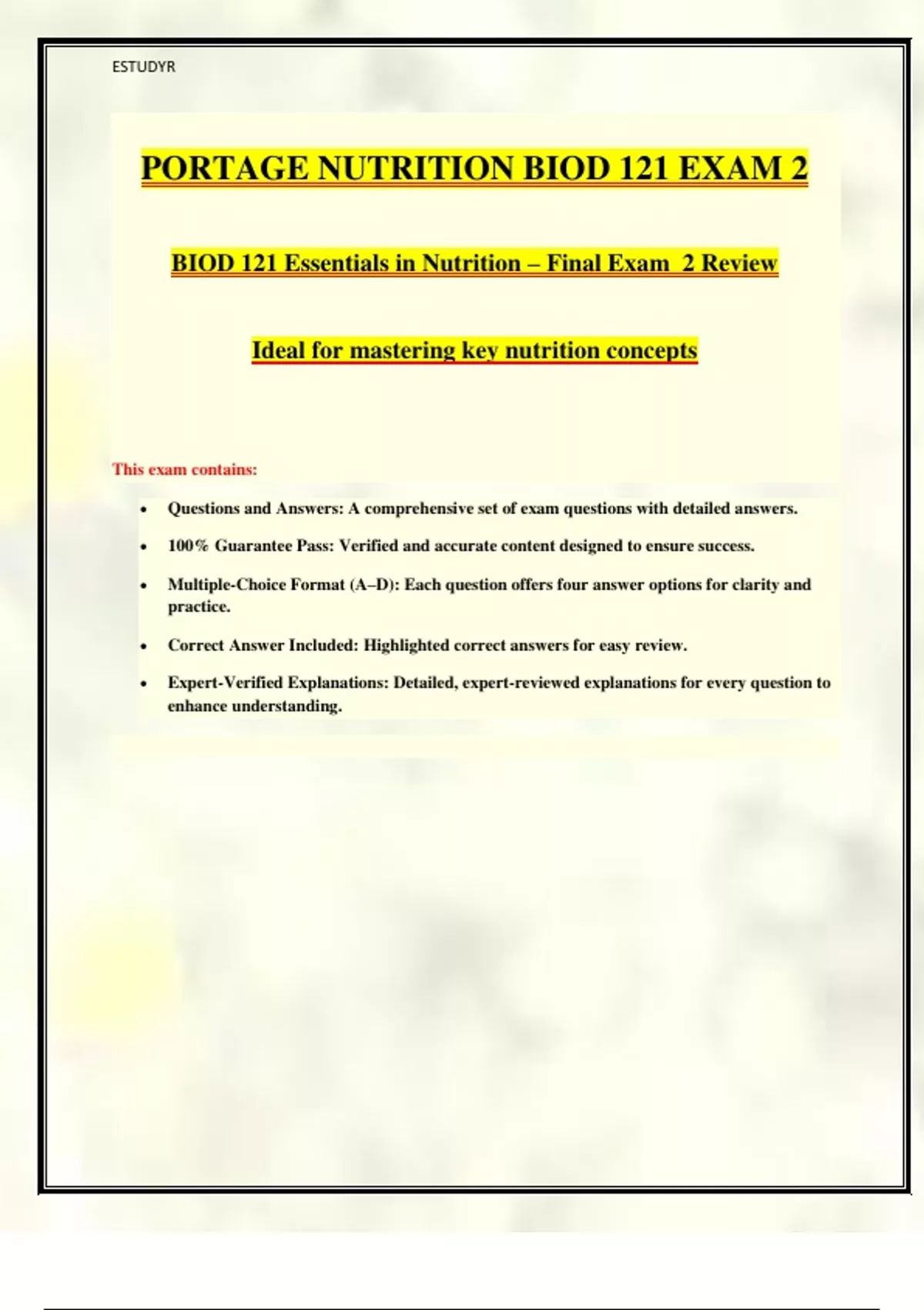 PORTAGE NUTRITION BIOD 121 EXAM 2