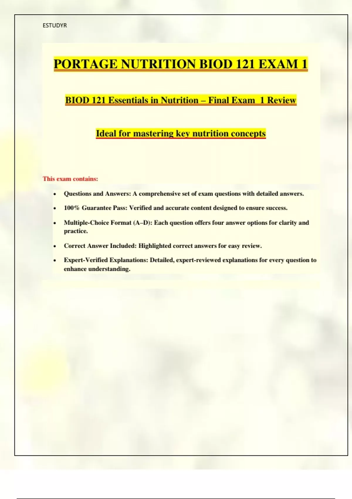 PORTAGE NUTRITION BIOD 121 EXAM 1