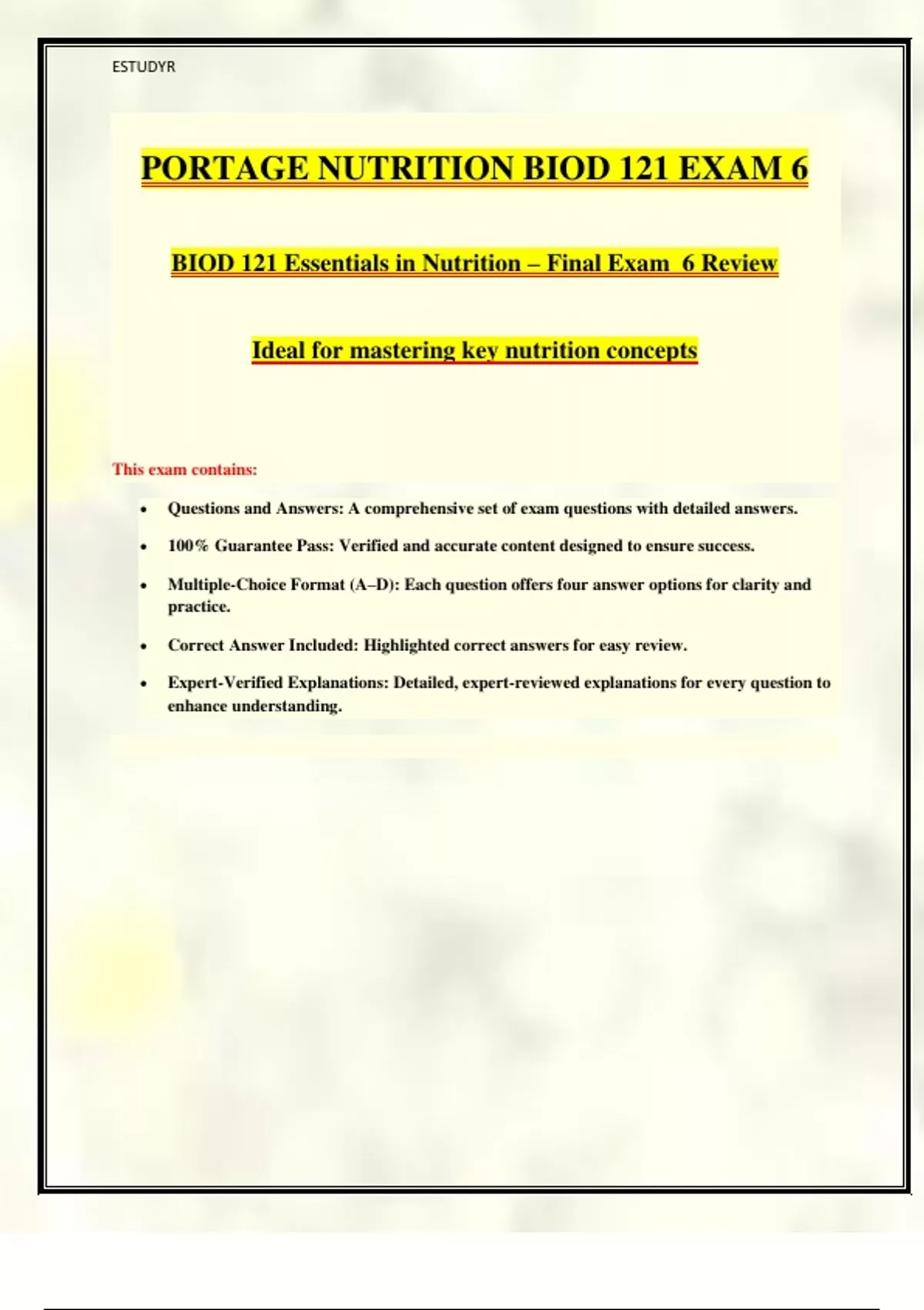 2025 PORTAGE NUTRITION BIOD 121 UPDATED EXAM 6 WITH MOST TESTED QUESTIONS AND ANSWERS | GRADED A+ | ASSURED SUCCESS WITH DETAILED RATIONALES