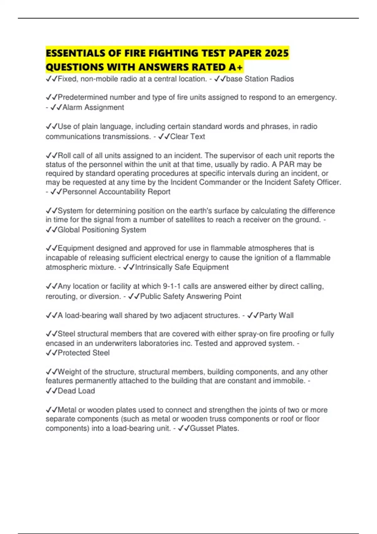ESSENTIALS OF FIRE FIGHTING TEST PAPER 2025 QUESTIONS WITH ANSWERS RATED A+