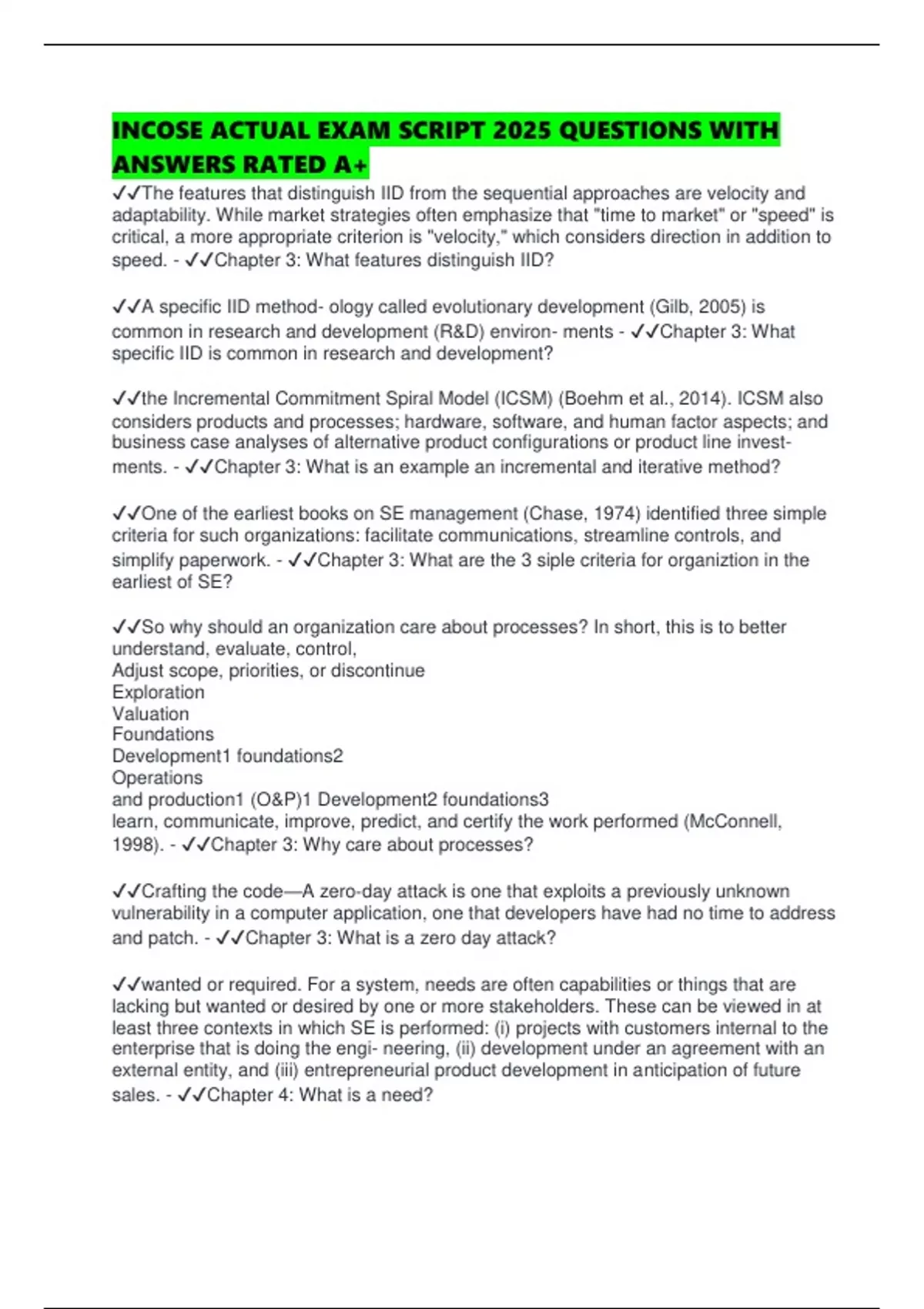 INCOSE ACTUAL EXAM SCRIPT 2025 QUESTIONS WITH ANSWERS RATED A+ The features that distinguish IID from the sequential approaches are velocity and adaptability. While market strategies often emphasize that "time to market" or "speed" is critical, a more appropriate criterion is "velocity," which considers direction in addition to speed. - Chapter 3: What features distinguish IID? A specific IID method- ology called evolutionary development (Gilb, 2005) is common in research and development (R&D) environ- ments - Chapter 3: What specific IID is common in research and development? the Incremental Commitment Spiral Model (ICSM) (Boehm et al., 2014). ICSM also considers products and processes; hardware, software, and human factor aspects; and business case analyses of alternative product configurations or product line investments. - Chapter 3: What is an example an incremental and iterative method? One of the earliest books on SE management (Chase, 1974) identified three simple criteria for such organizations: facilitate communications, streamline controls, and simplify paperwork. - Chapter 3: What are the 3 siple criteria for organiztion in the earliest of SE?