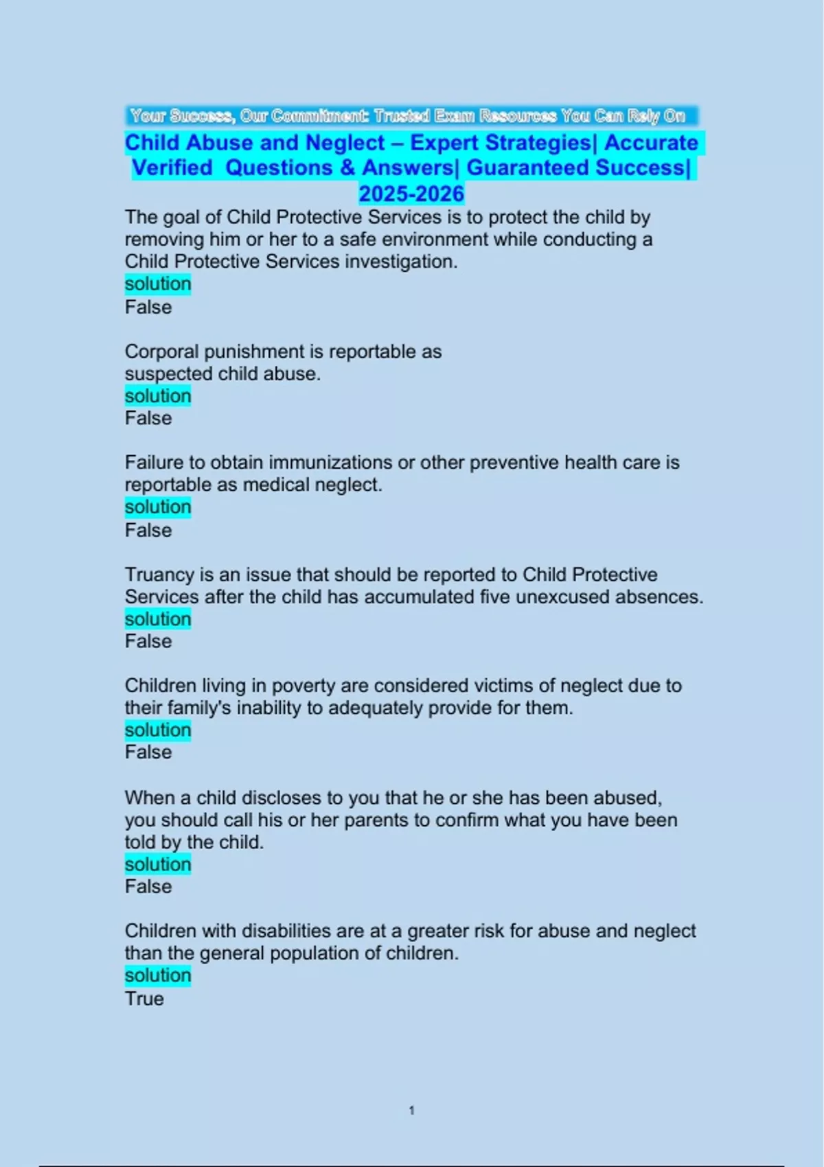 Child Abuse and Neglect– Expert Strategies| Accurate Verified Questions & Answers| Guaranteed Success| The goal of Child Protective Services is to protect the child by removing him or her to a safe environment while conducting a Child Protective Services investigation. solution False Corporal punishment is reportable as suspected child abuse. solution False Failure to obtain immunizations or other preventive health care is reportable as medical neglect. solution False Truancy is an issue that should be reported to Child Protective Services after the child has accumulated five unexcused absences. solution False