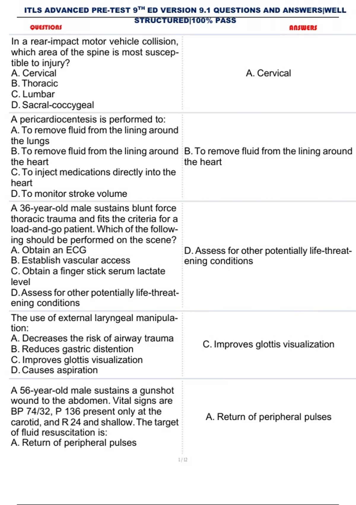 , ITLS ADVANCED PRE-TEST 9TH ED VERSION 9.1 QUESTIONS AND ANSWERS|WELL
