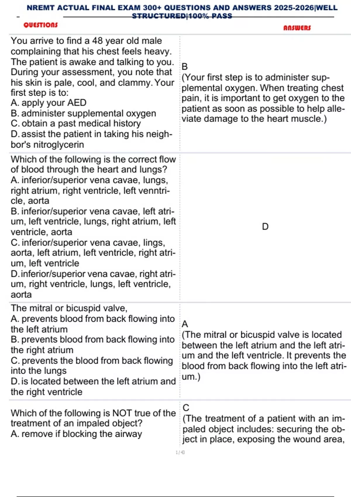 NREMT ACTUAL FINAL EXAM 300+ QUESTIONS AND ANSWERS |WELL STRUCTURED|100% PASS