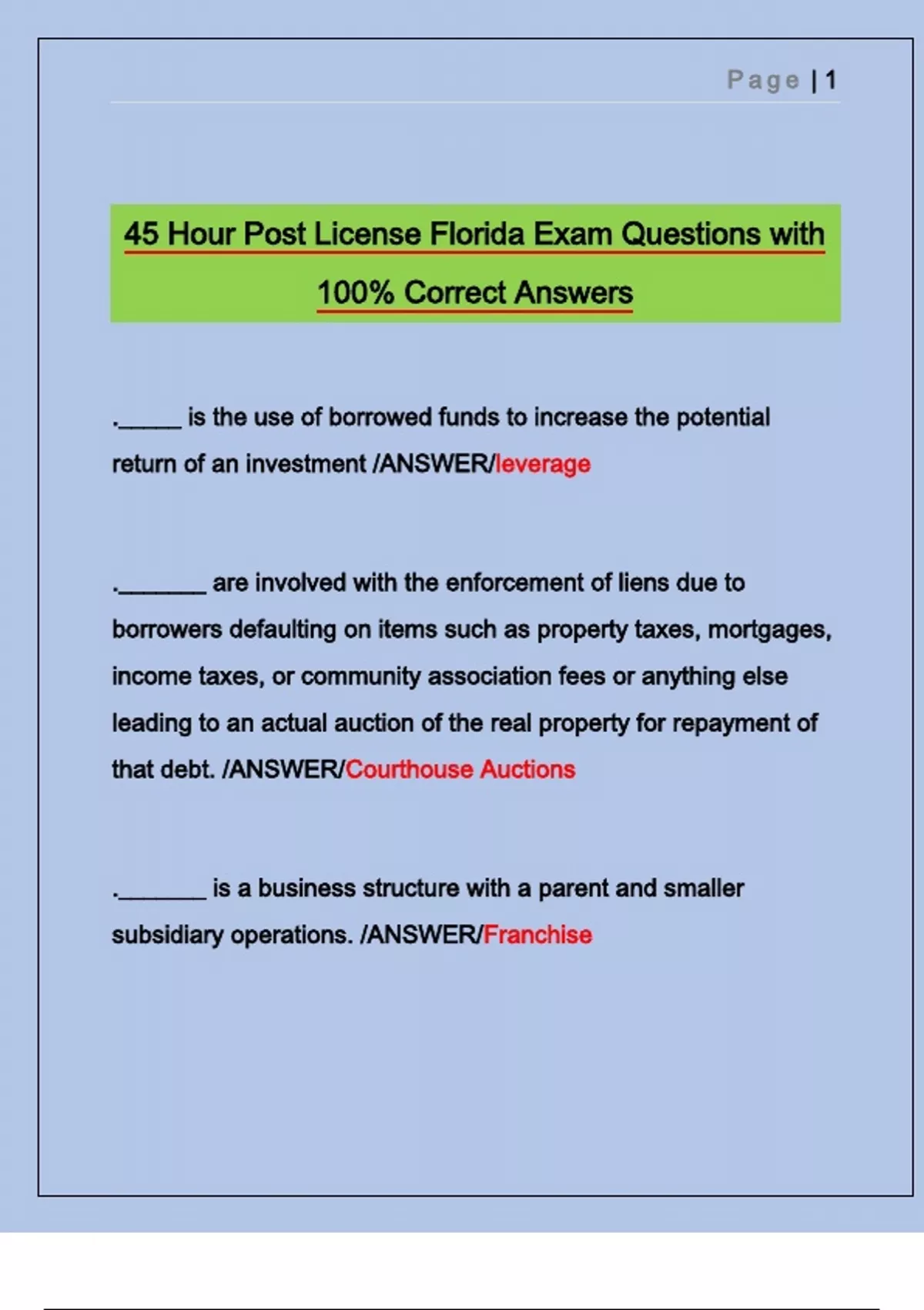 45 Hour Post License Florida Exam Questions with 100% Correct Answers
