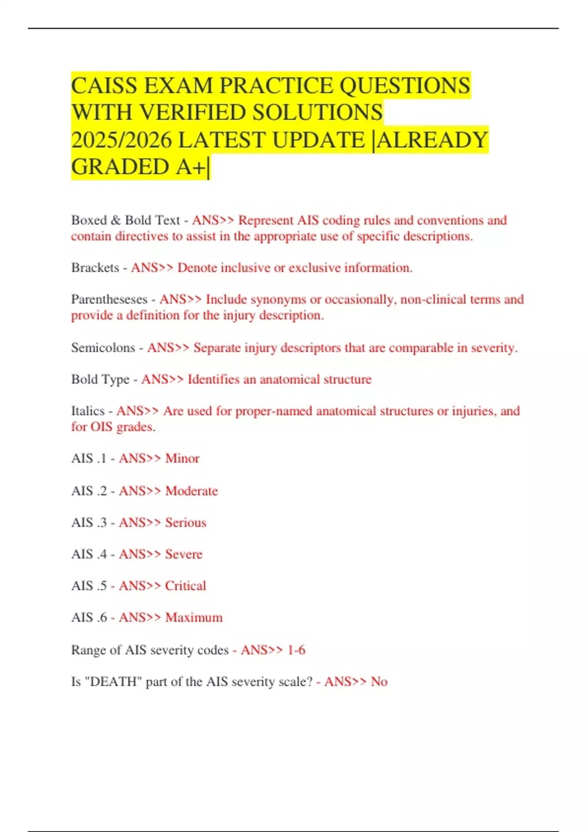 CAISS EXAM PRACTICE QUESTIONS WITH VERIFIED SOLUTIONS 2025/2026 LATEST UPDATE |ALREADY GRADED A+| Boxed & Bold Text - ANS Represent AIS coding rules and conventions and contain directives to assist in the appropriate use of specific descriptions. Brackets - ANS Denote inclusive or exclusive information. Parentheseses - ANS Include synonyms or occasionally, non-clinical terms and provide a definition for the injury description. Semicolons - ANS Separate injury descriptors that are comparable in severity. Bold Type - ANS Identifies an anatomical structure Italics - ANS Are used for proper-named anatomical structures or injuries, and for OIS grades. AIS .1 - ANS Minor AIS .2 - ANS Moderate AIS .3 - ANS Serious AIS .4 - ANS Severe AIS .5 - ANS Critical AIS .6 - ANS Maximum Range of AIS severity codes - ANS 1-6 Is "DEATH" part of the AIS severity scale? - ANS No Does a linear relationship exist between AIS severity codes? - ANS No (T/F) Injuries within the same code may not be strictly compatible. - ANS T AIS .9 - ANS Unknown (T/F) The AIS single digit severity number indicates the relative severity of injury in an "average person" who sustains the coded injury as his only injury. - ANS T Average Patient - ANS Adult 25-40 years of age Free of pre-existing conditions Free of treatment complications Receiving timely, appropriate care for the injury Pre-dot Code - ANS 6 digits to the left of decimal point AIS Severity Number - ANS A single digit to the right of the decimal point. Body Region - ANS The first number in the pre-dot code stands for? Type of Anatomic Structure - ANS The second number in the pre-dot code stands for? Specific Anatomic Structure - ANS The third & fourth numbers in the pre-dot code stands for? Level of injury within the specific body region and anatomic structure - ANS The fifth & sixth numbers in the pre-dot code stands for? (T/F) AIS assesses the severity of single injuries. - ANS T (T/F) The ISS is the sum of the squares of the highest AIS in each of the (3) most severity injured ISS body regions. - ANS T There are how many ISS body regions? - ANS 6 ISS Body Regions - ANS Head & Neck Face Chest Abdominal & Pelvic Contents Extremities & Pelvic Girdle External Head & Neck - ANS Include injury to the brain, skull, cervical spine or neck organs. (T/F) Asphyxia is assigned to the ISS Head region? - ANS T Face - ANS Include injury to mouth, ears, eyes, nose and facial bones. Chest - ANS Include injury to abdominal and pelvic contents, including all lesions to internal organs in the respective cavities and injuries to diaphragm, rib cage and thoracic spine. (T/F) Drowning is assigned to the Chest region? - ANS T (T/F) The ISS is the sum of the squares of the highest AIS in each of the (5) most severity injured ISS body regions. - ANS F (T/F) There are 9 ISS body regions? - ANS F (T/F) Asphyxia is assigned to the ISS Chest region? - ANS F (T/F) Drowning is assigned to the Head & Neck region? - ANS f Abdomen and Pelvic Area - ANS Include injury to Lumber spine lesions. External - ANS Injuries that include lacerations, contusions, abrasions, hypothermia, electrical injury, whole body injury and burns are assigned to what region? 1-75 - ANS The ISS score ranges from what to what? (T/F) An ISS of 75 can be derived in 2 ways: one AIS .5 injury in each of three body regions or a single AIS .6 injury. - ANS T Should patients with a AIS .9 code be included in research studies? - ANS No