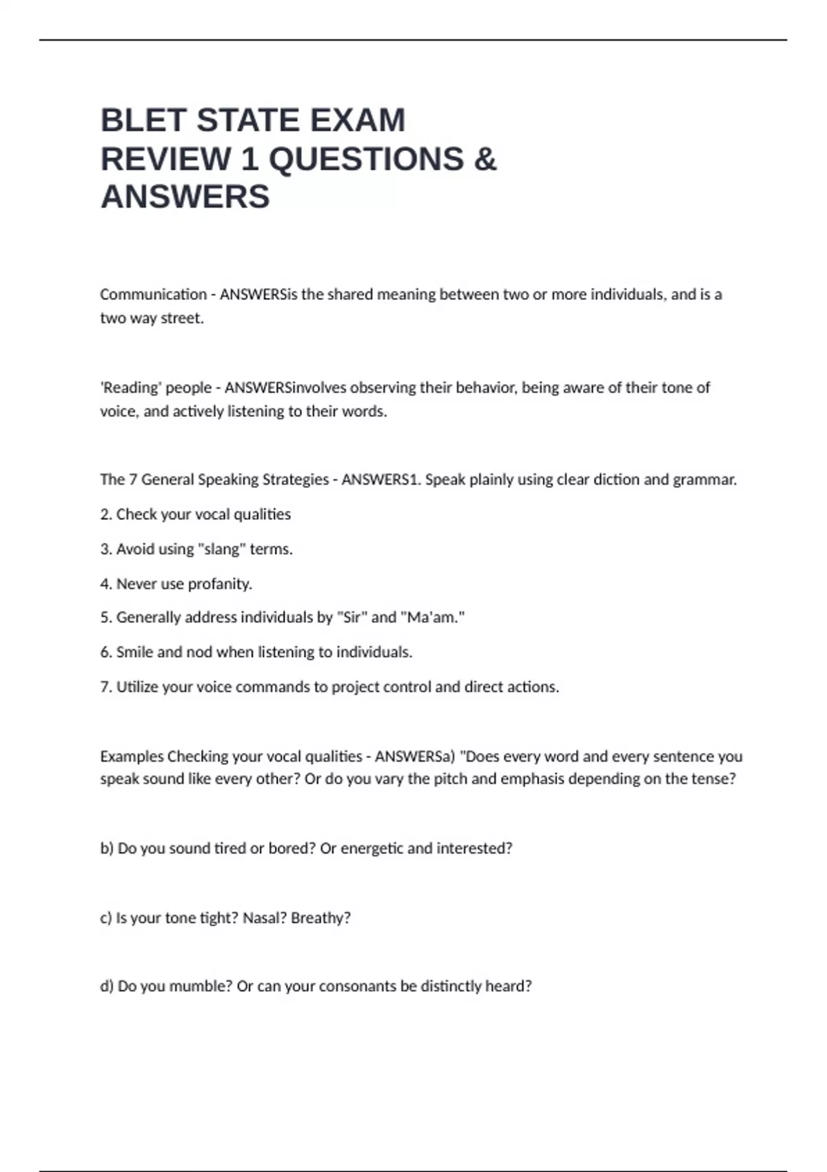 BLET STATE EXAM REVIEW 1 QUESTIONS & ANSWERS Communication - ANSWERSis the shared meaning between two or more individuals, and is a two way street. 'Reading' people - ANSWERSinvolves observing their behavior, being aware of their tone of voice, and actively listening to their words. The 7 General Speaking Strategies - ANSWERS1. Speak plainly using clear diction and grammar. 2. Check your vocal qualities 3. Avoid using "slang" terms. 4. Never use profanity. 5. Generally address individuals by "Sir" and "Ma'am." 6. Smile and nod when listening to individuals. 7. Utilize your voice commands to project control and direct actions. Examples Checking your vocal qualities - ANSWERSa) "Does every word and every sentence you speak sound like every other? Or do you vary the pitch and emphasis depending on the tense? b) Do you sound tired or bored? Or energetic and interested? c) Is your tone tight? Nasal? Breathy? d) Do you mumble? Or can your consonants be distinctly heard?