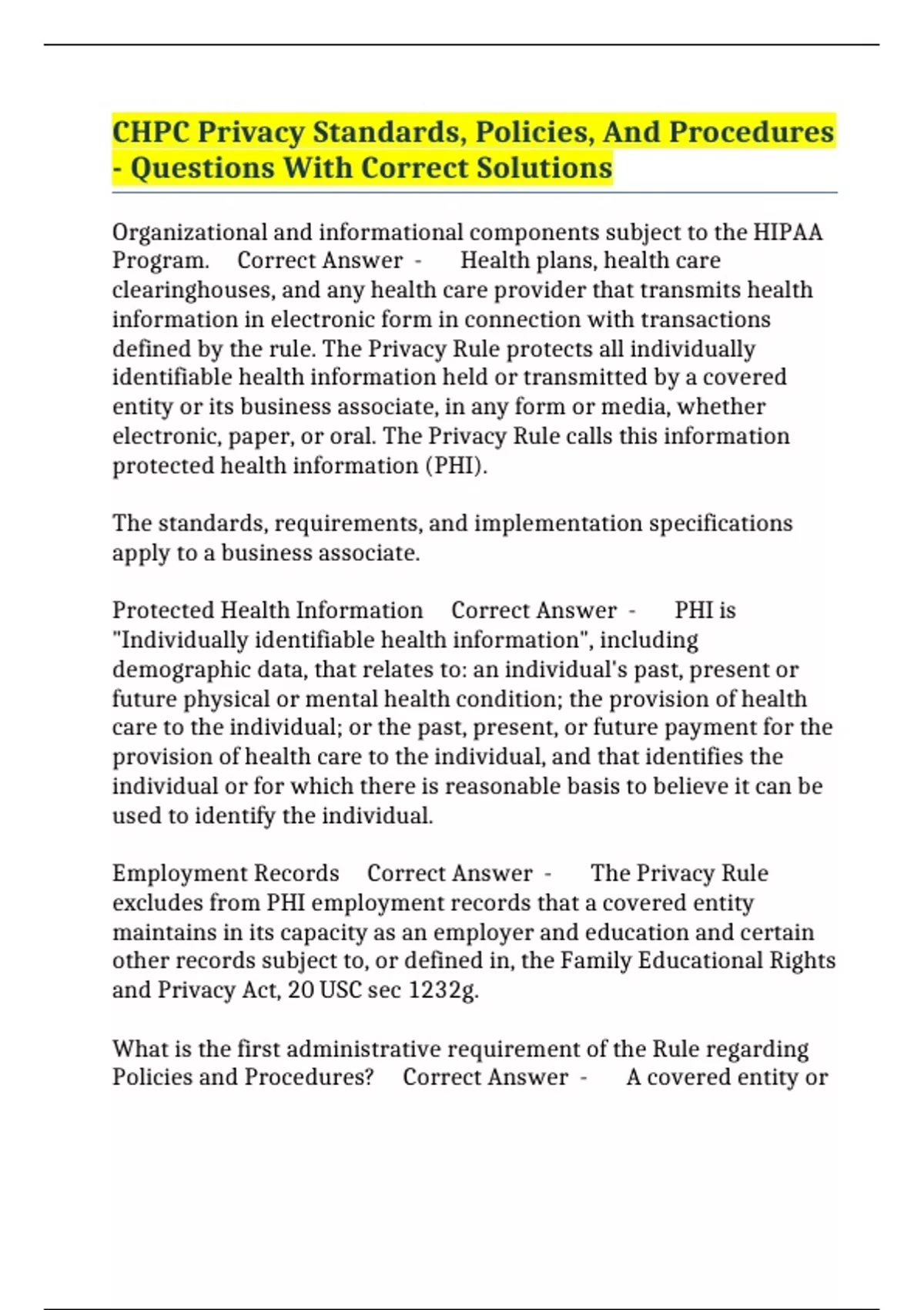 CHPC Privacy Standards, Policies, And Procedures - Questions With Correct Solutions