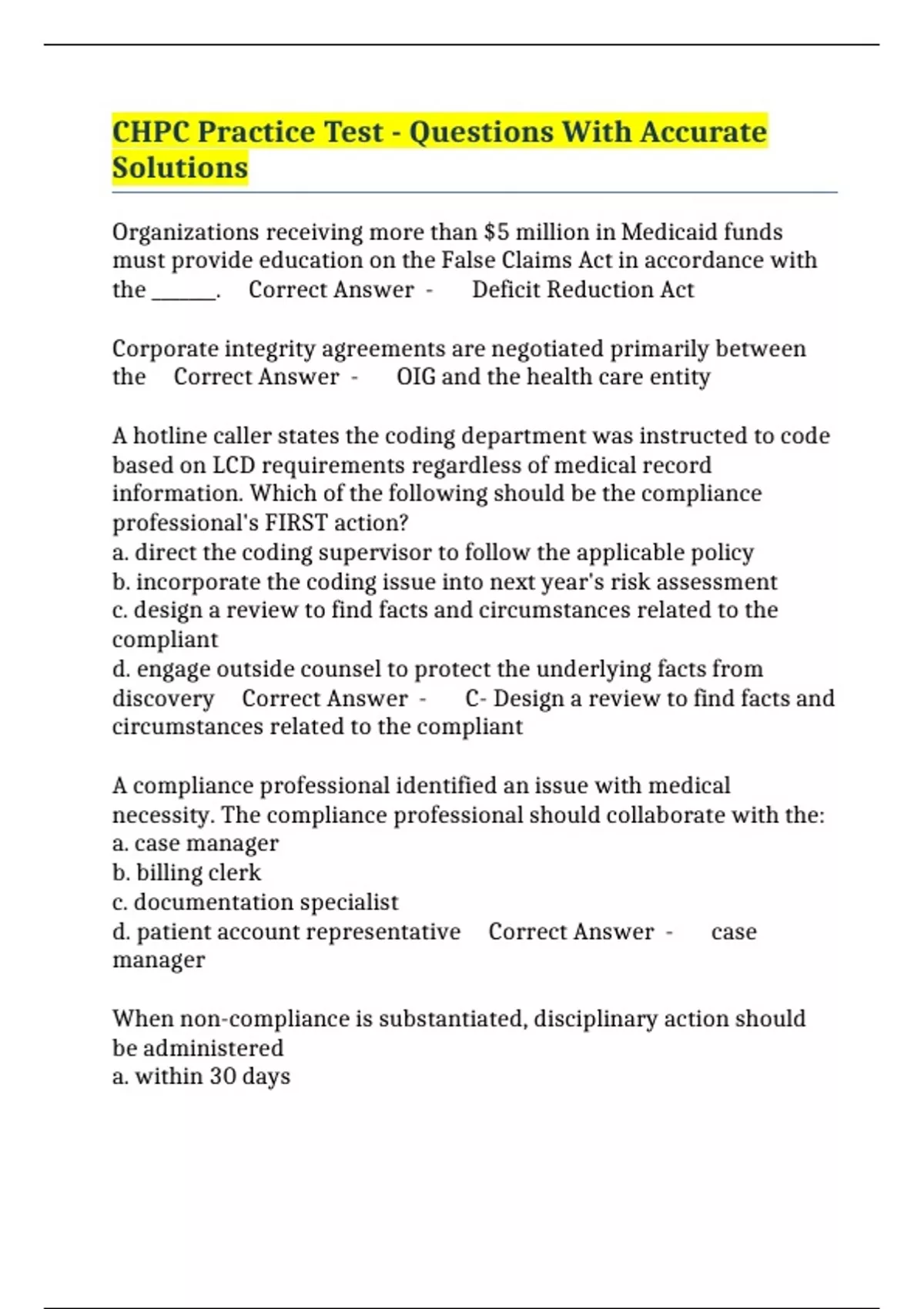 CHPC Practice Test - Questions With Accurate