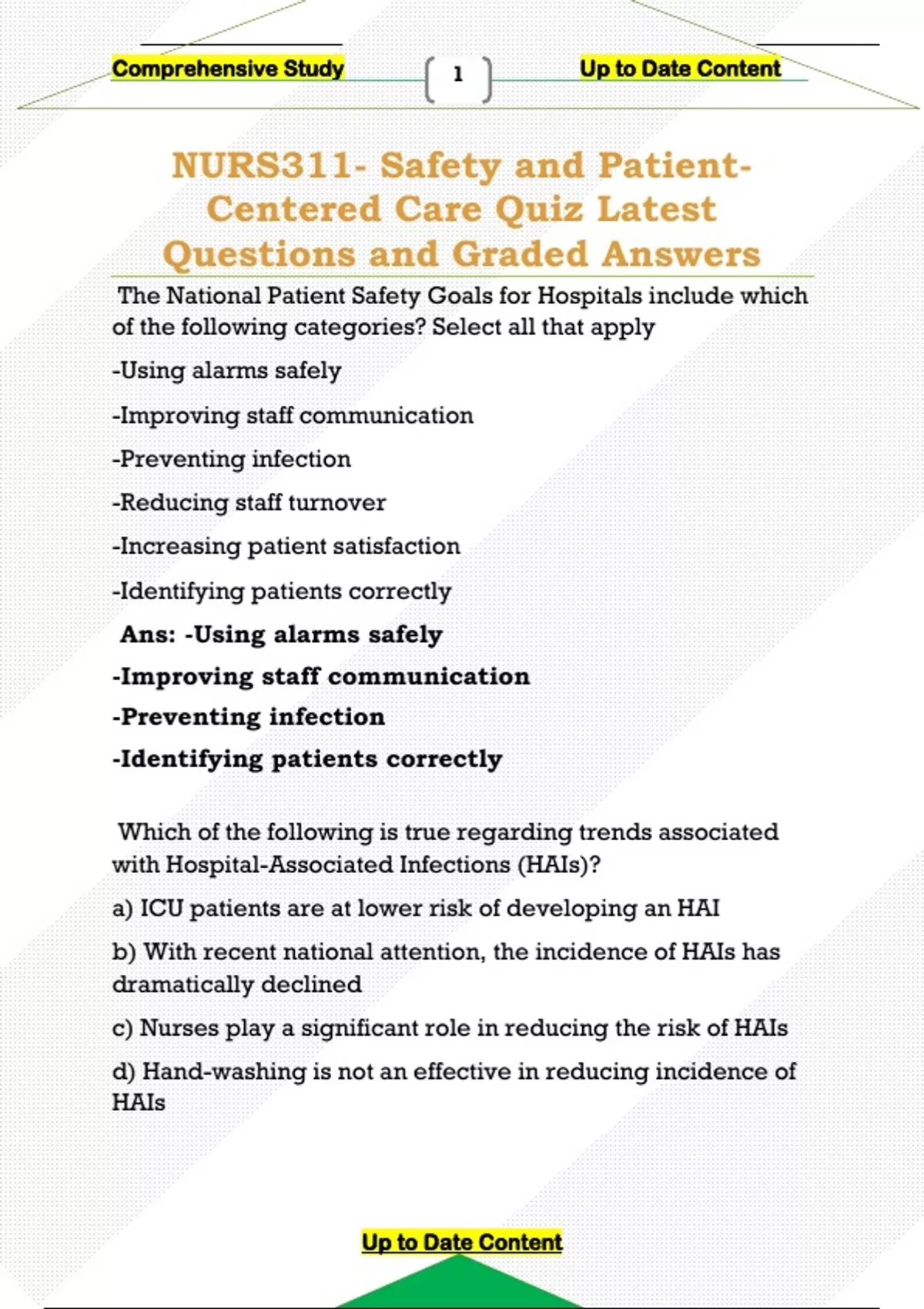 NURS311- Safety and Patient Centered Care Quiz Latest Questions and Graded Answers