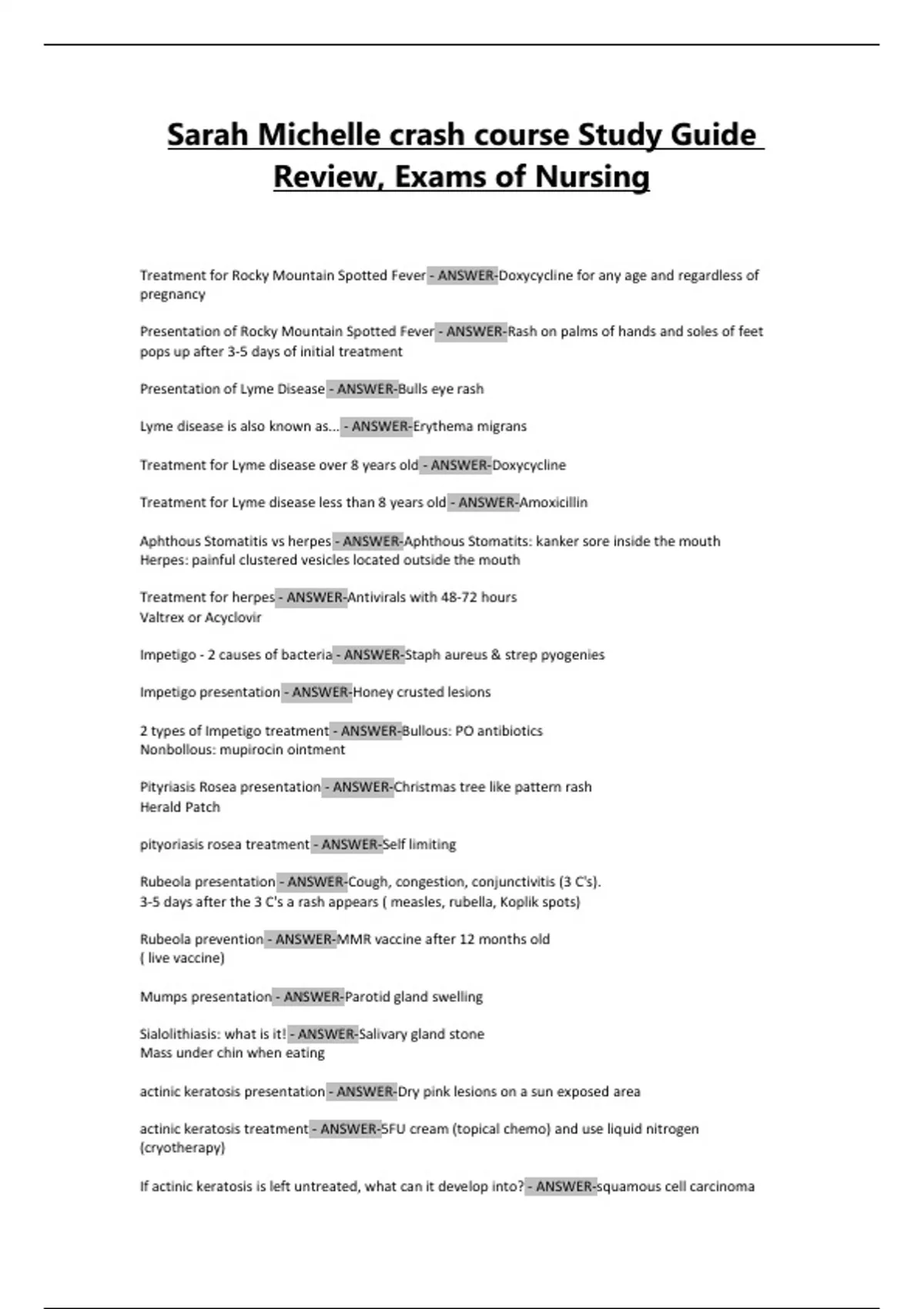 Sarah Michelle crash course Study Guide Review, Exams of Nursing