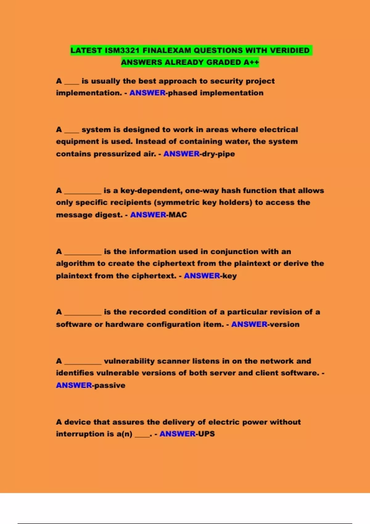 LATEST ISM3321 FINALEXAM QUESTIONS WITH VERIDIED ANSWERS ALREADY GRADED A++ A ____ is usually the best approach to security project implementation. - ANSWER-phased implementation A ____ system is designed to work in areas where electrical equipment is used. Instead of containing water, the system contains pressurized air. - ANSWER-dry-pipe A __________ is a key-dependent, one-way hash function that allows only specific recipients (symmetric key holders) to access the message digest. - ANSWER-MAC A __________ is the information used in conjunction with an algorithm to create the ciphertext from the plaintext or derive the plaintext from the ciphertext. - ANSWER-key A __________ is the recorded condition of a particular revision of a software or hardware configuration item. - ANSWER-version A __________ vulnerability scanner listens in on the network and identifies vulnerable versions of both server and client software. - ANSWER-passive A device that assures the delivery of electric power without interruption is a(n) ____. - ANSWER-UPS A method of encryption that requires the same secret key to encipher and decipher the message is known as __________ encryption. - ANSWER-symmetric A primary mailing list for new vulnerabilities, called simply __________, provides time-sensitive coverage of emerging vulnerabilities, documenting how they are exploited and reporting on how to remediate them. Individuals can register for the flagship mailing list or any one of the entire family of its mailing lists. - ANSWER-Bugtraq A process called __________ examines the traffic that flows through a system and its associated devices to identify the most frequently used devices. - ANSWER-traffic analysis A step commonly used for Internet vulnerability assessment includes __________, which occurs when the penetration test engine is unleashed at the scheduled time using the planned target list and test selection. - ANSWER-Scanning A(n) __________ IDPS is focused on protecting network information assets. - ANSWER-network-based A(n) __________ is a software program or hardware appliance that can intercept, copy, and interpret network traffic. - ANSWER-packet sniffer A(n) __________ is an event that triggers an alarm when no actual attack is in progress. - ANSWER-false attack stimulus A(n) __________ item is a hardware or software item that is to be modified and revised throughout its life cycle. - ANSWER-configuration A(n) __________ port, also known as a monitoring port, is a specially configured connection on a network device that is capable of viewing all of the traffic that moves through the entire device. - ANSWER-SPAN A(n) __________ works like a burglar alarm in that it detects a violation (some system activities analogous to an opened or broken window) and activates an alarm. - ANSWER-IDPS A(n) ____, typically prepared in the analysis phase of the SecSDLC, must be reviewed and verified prior to the development of the project plan. - ANSWER-CBA According to Schwartz, Erwin, Weafer, and Briney, "__________" are the real techies who create and install security solutions. - ANSWER-Builders Activities that scan network locales for active systems and then identify the network services offered by the host systems are known as __________. - ANSWER-fingerprinting An X.509 v3 certificate binds a ___________, which uniquely identifies a certificate entity, to a user's public key. - ANSWER-distinguished name At the World Championships in Athletics in Helsinki in August 2005, a virus called Cabir infected dozens of __________, the first time this occurred in a public setting. - ANSWER-Bluetooth mobile phones Bit stream methods commonly use algorithm functions like the exclusive OR operation (__________). - ANSWER-XOR By managing the ____, the organization can reduce unintended consequences by having a process to resolve potential conflict and disruption that uncoordinated change can introduce. - ANSWER-process of change Class ____ fires are extinguished by agents that remove oxygen from the fire. - ANSWER-B Class ____ fires are extinguished with non-conducting agents only. - ANSWER-C Common vulnerability assessment processes include: - ANSWER-All of these Computing and other electrical equipment in areas where water can accumulate must be uniquely grounded, using ____ equipment. - ANSWER-GFC Control __________ baselines are established for network traffic and for firewall performance and IDPS performance. - ANSWER-performance DES uses a(n) ___________-bit block size. - ANSWER-64 Detailed __________ on the highest risk warnings can include identifying which vendor updates apply to which vulnerabilities as well as which types of defenses have been found to work against the specific vulnerabilities reported. - ANSWER-intelligence Digital signatures should be created using processes and products that are based on the __________. - ANSWER-DSS Each organization sets policy to choose one of two approaches when employing digital forensics. Select the statement that best identifies the options. - ANSWER-Both of these are approaches that might be chosen Electronic monitoring includes ____ systems. - ANSWER-closed-circuit television Fire ____ systems are devices installed and maintained to detect and respond to a fire, potential fire, or combustion danger situation. - ANSWER-suppression If the task is to write firewall specifications for the preparation of a(n) ____, the planner would note that the deliverable is a specification document suitable for distribution to vendors. - ANSWER-RFP In a ____ implementation, the entire security system is put in place in a single office, department, or division, and issues that arise are dealt with before expanding to the rest of the organization. - ANSWER-pilot In digital forensics, all investigations follow the same basic methodology once permission for search and seizure has been obtained. Which of the following is NOT one of the elements of that process? - ANSWER-Determine whether to "app